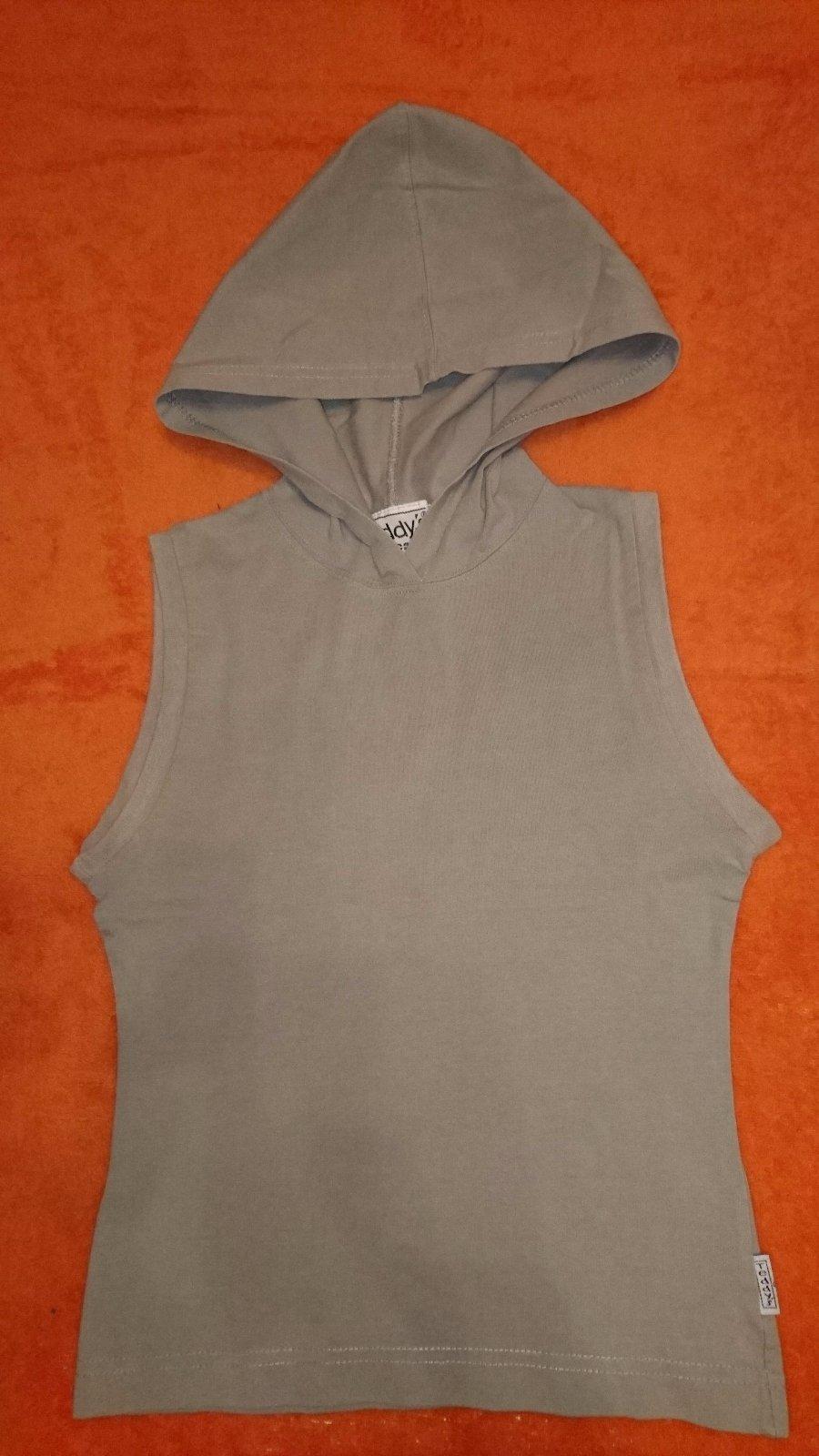 Zachovalé, nepoškodené, šedé tričko bez rukávov s kapucňou.