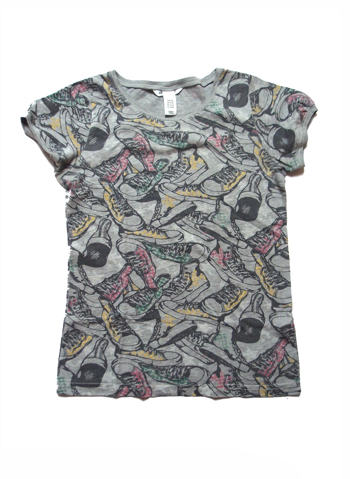 šedé s teniskovým vzorom zn. H&M uv. veľ. 164 ale povedala by som max 134-146 dl. 53cm, šírka pod pazuškami v kľude 40x2, veľmi dobrý nosený stav bez poškodení.