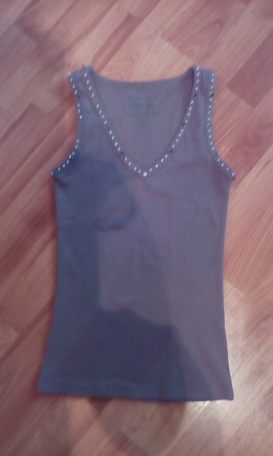Top z príjemného materiálu, v dekolte zdobený kamienkami. Dobre padnúci, hodí sa ku všetkému. Bežné známky nosenia, inak bez vád, v dobrom stave.