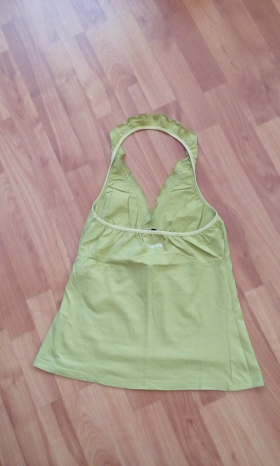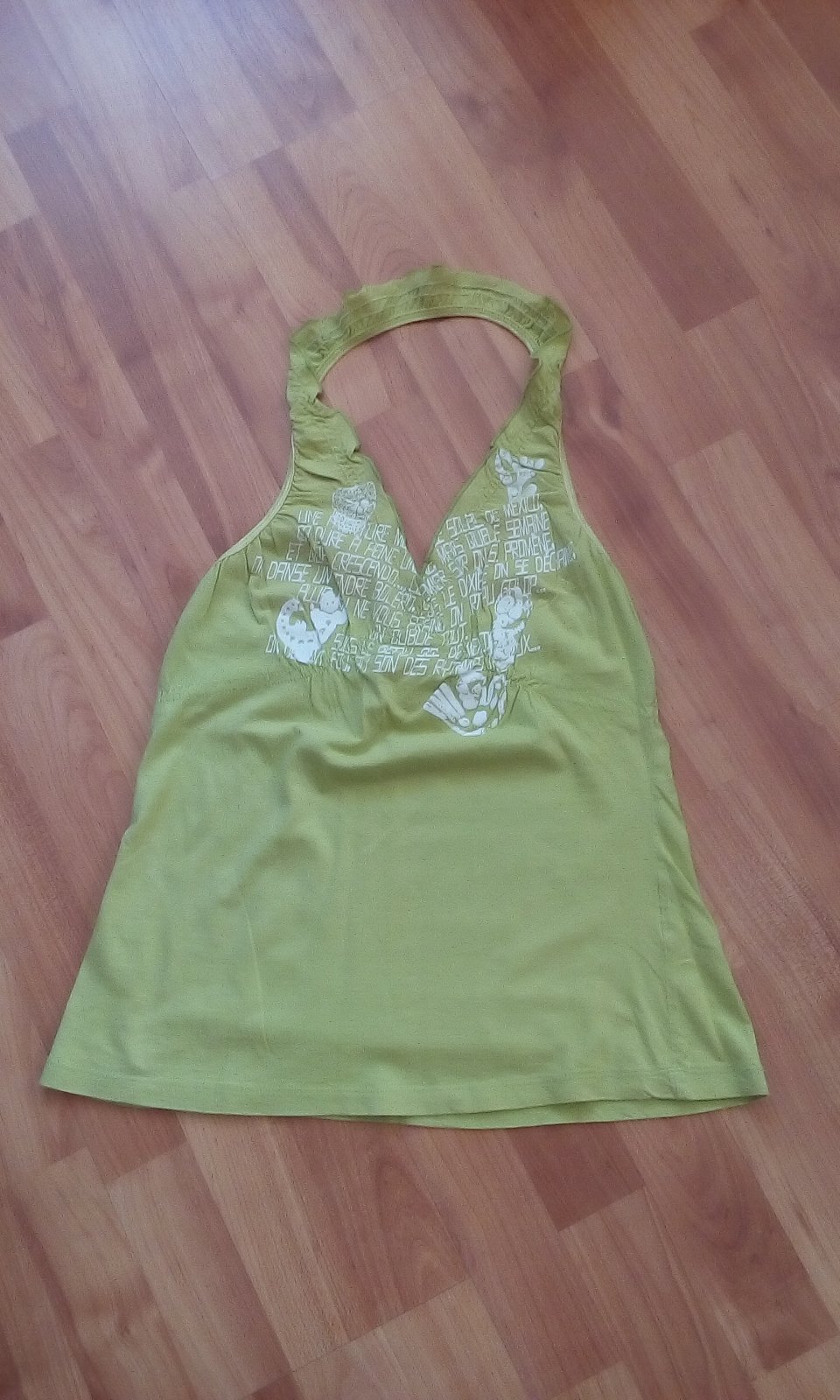 Mentolová zelená farba. Veľkosť sedí na S. Na chrbte ja malá hnedá bodka, viď foto, preto taká cena. Cena 1€ + poštovné. Darujem k objednávke u mňa, stačí si požiadať.