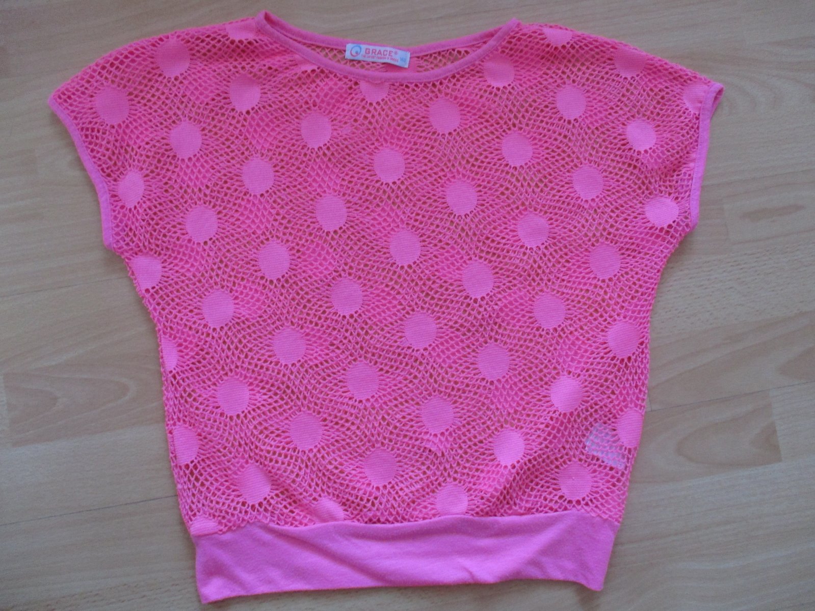 Predám pekné sieťované tričko, je málo nosené. Vyzerá ako pletené alebo háčkované. Veľkosť je 140. Cena je 3€+ poštovné.