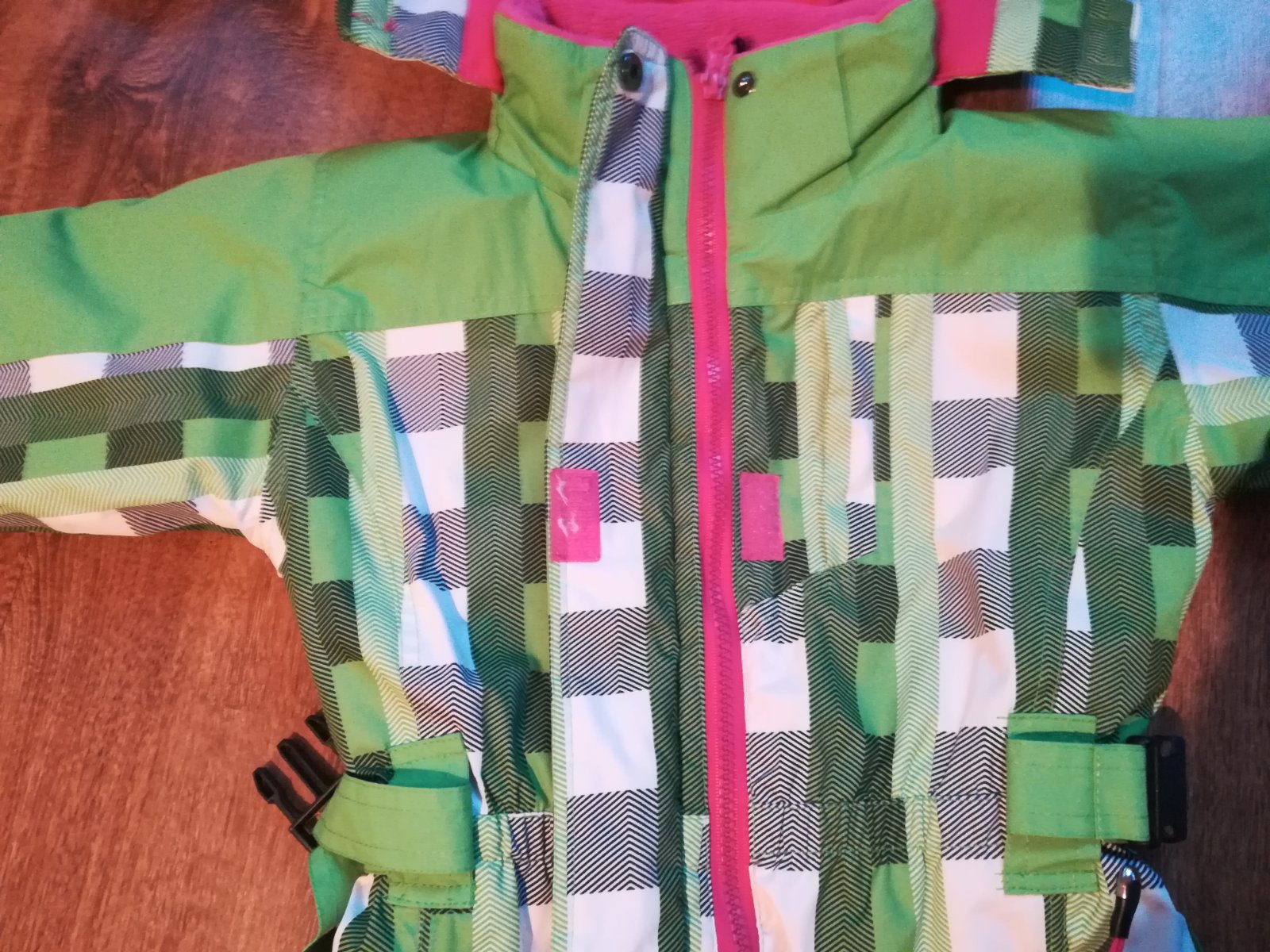 Kapuca je na zips. Dá sa odopnuť. Vačky na overal sú funkčné. Na konci sú gumičky na obuv.