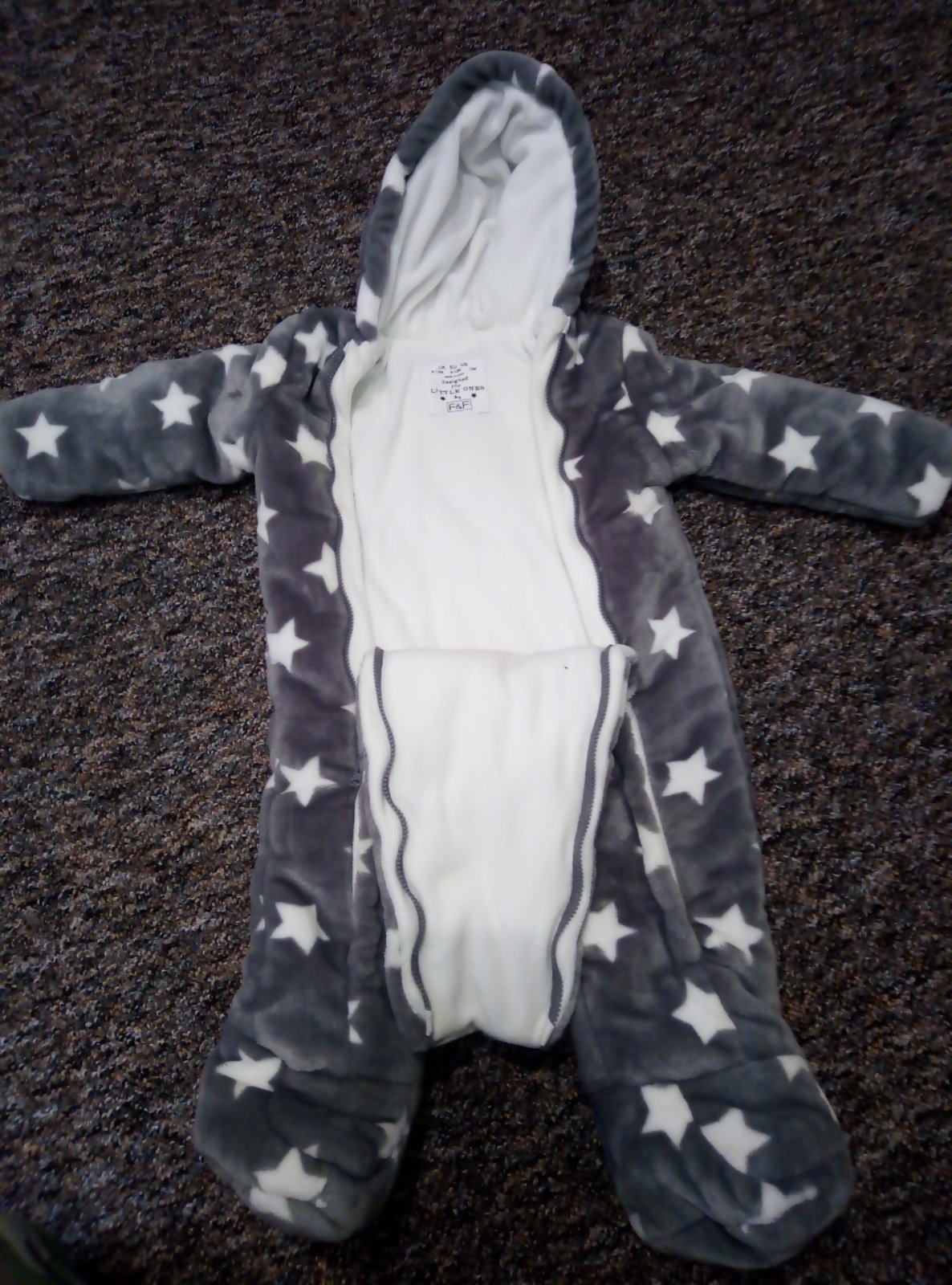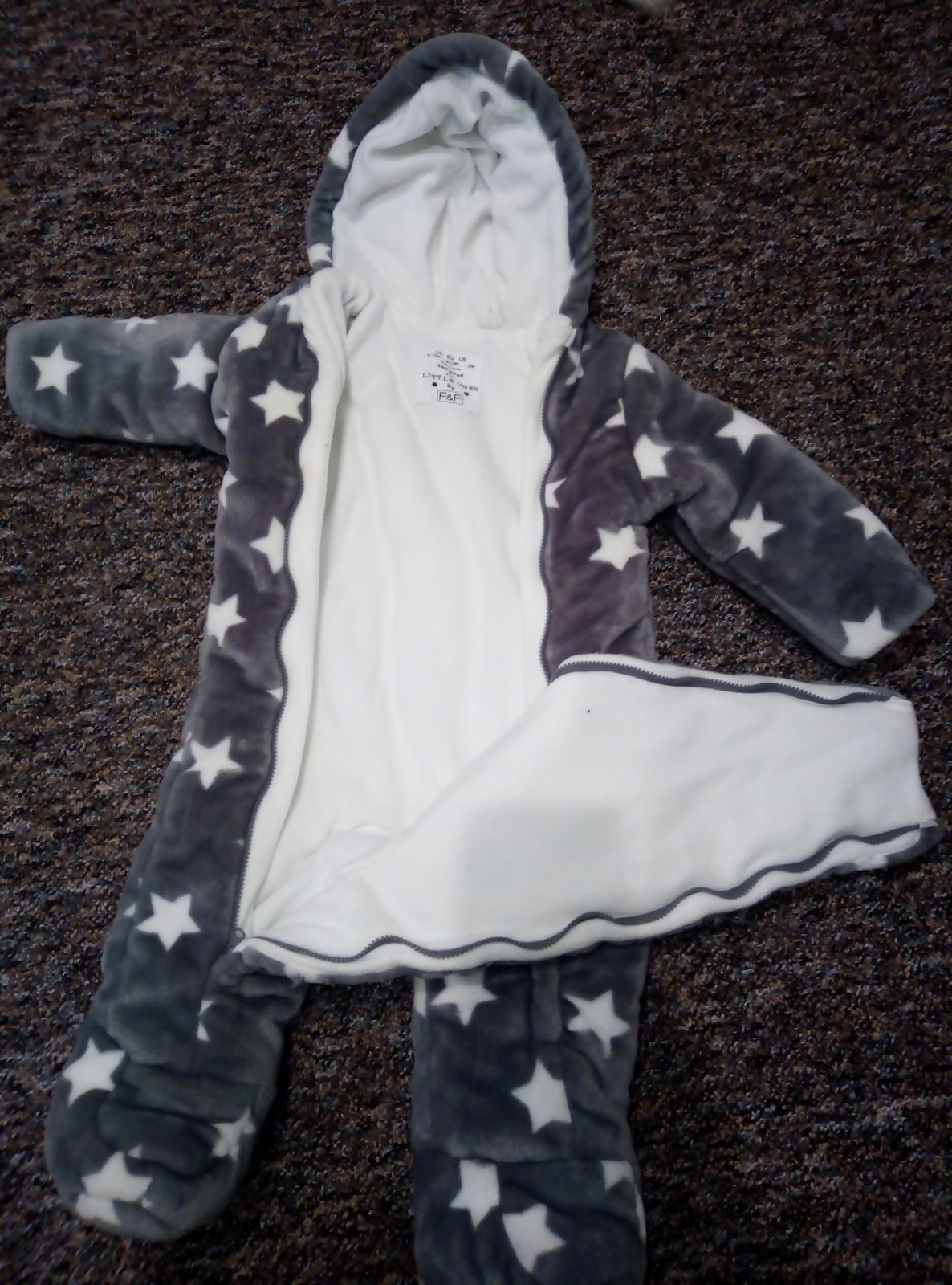 Teplučký zimný overal dekovinovy , pár krát oblečený, ako nový , top stav., nôžky sú uzavrete, vhodný do kočíka aj na sane,, pôvodná cena 25 €, veľkosť orientačné 74, veľkosť uvedená na 9-12 mesiacov