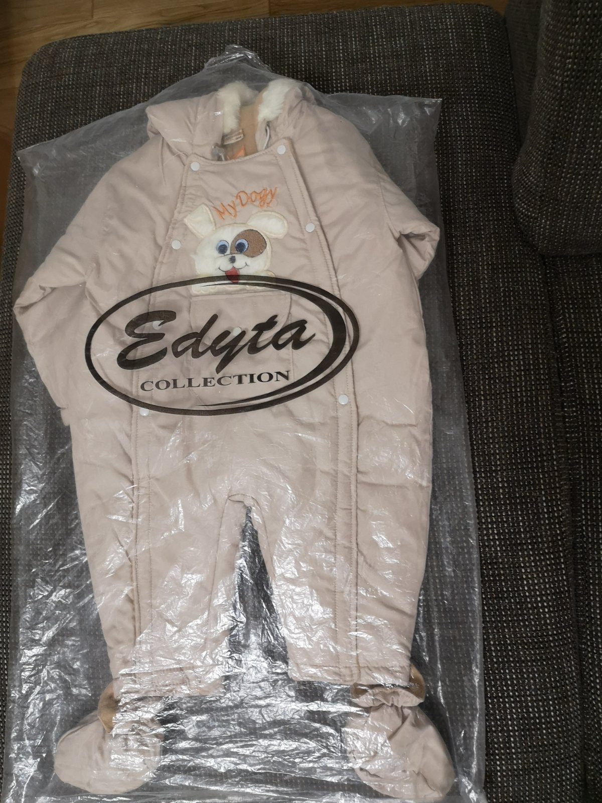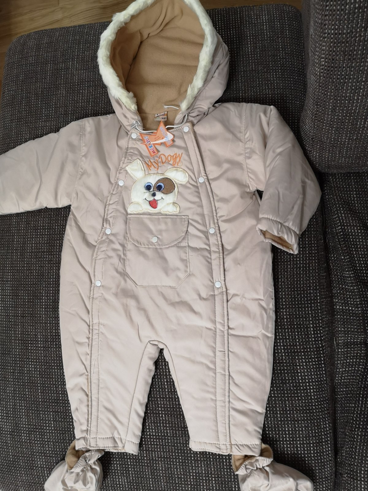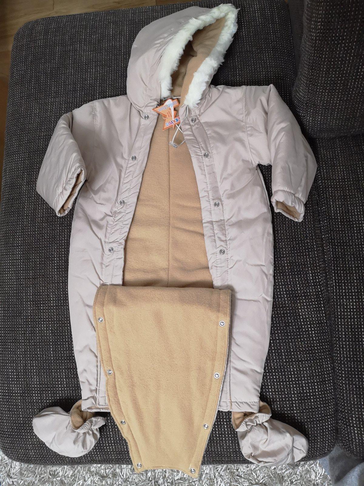 Béžový overal na zimu, nový, nenoseny, kupovaný v predstihu v detskom obchodíku, neodhadli sme veľkosť, podsity flisom, topánočky na pripinanie, kapucňa na pevno. Celková dĺžka od krku dole bez topánky, čiže ku členkom je 61 cm, dĺžka rukávu od krku 38 cm, pod pazuchou 26 cm, šírka v páse 38 cm. Zapínanie na cvočky.