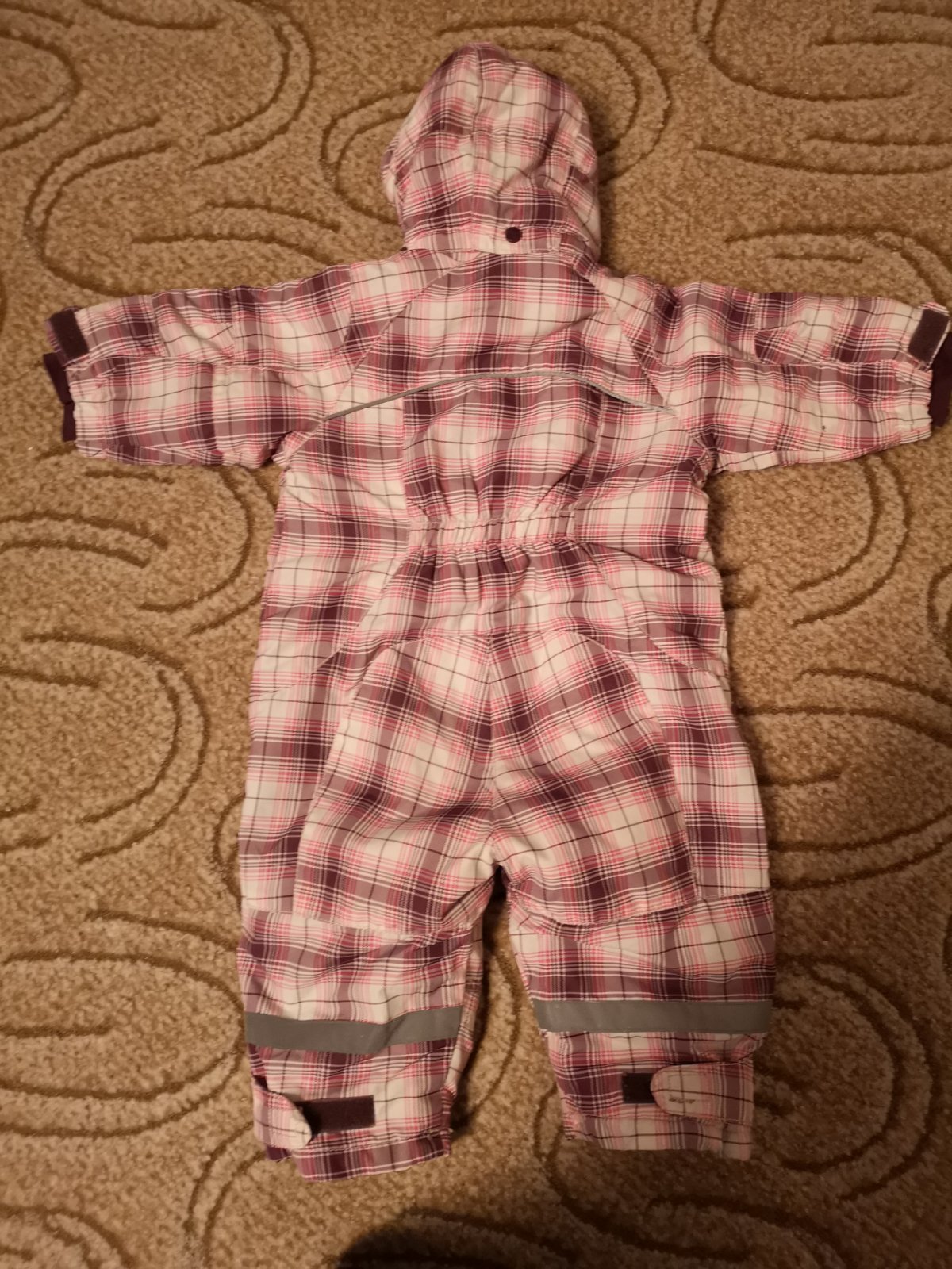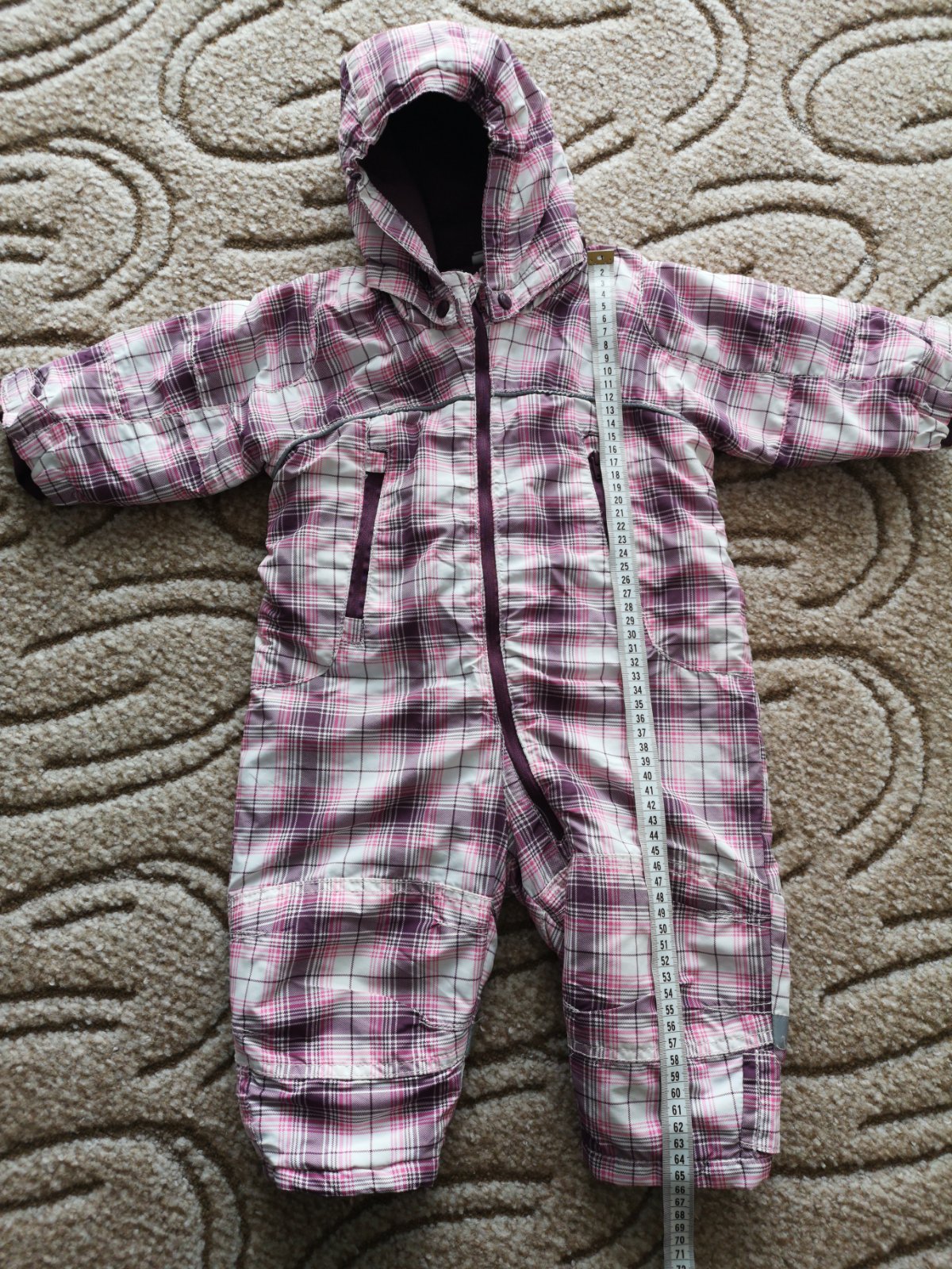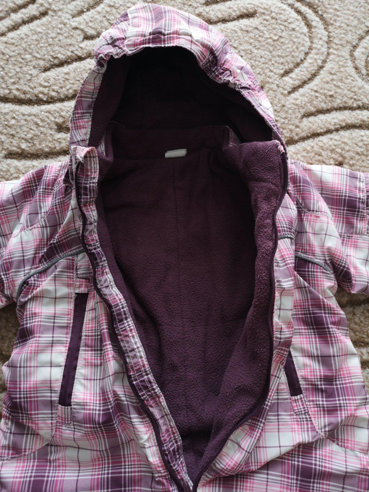 V prípade záujmu darujem k nákupu. Máme ju tu z MK. Veľmi vďačná kombinéza, maximálna spokojnosť, v snehu nám nepremokla a ani nás neprefúkalo. Má už svoje nedostatky, ale ešte poslúži, aspoň na dvor. Kapucňa je na cvoky, dá sa odopnúť. Na jednej kapse na zipse už chýbal bežec, kapsa sa nedá odopnúť, je zazipsovaná, neprekážalo nám to. Hlavný zips hore pri krku zadrhával už od začiatku ako sme ju kúpili, ale ak sa človek posnaží, dá sa zapnúť celý až ku krku. Dole na nožičkách boli gumky pod topánky, aby sa overal nevysúval, preto tie gombíky, kúpili sme ju už bez gumičiek, nechýbali nám. Myslím, že nie je problém kúpiť dierkovanú gumku v galantérii. Na rukávoch je látka - patent s otvormi na palec, látka ma žmolky. Na uvedené číslo 74 je väčšia, preto píšem veľkosť 80, rozmery na foto.