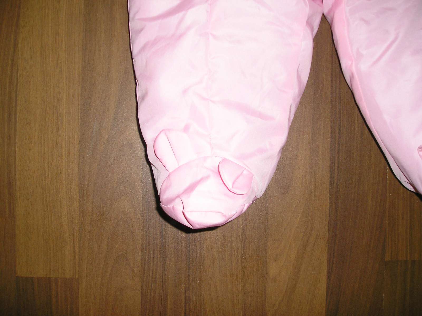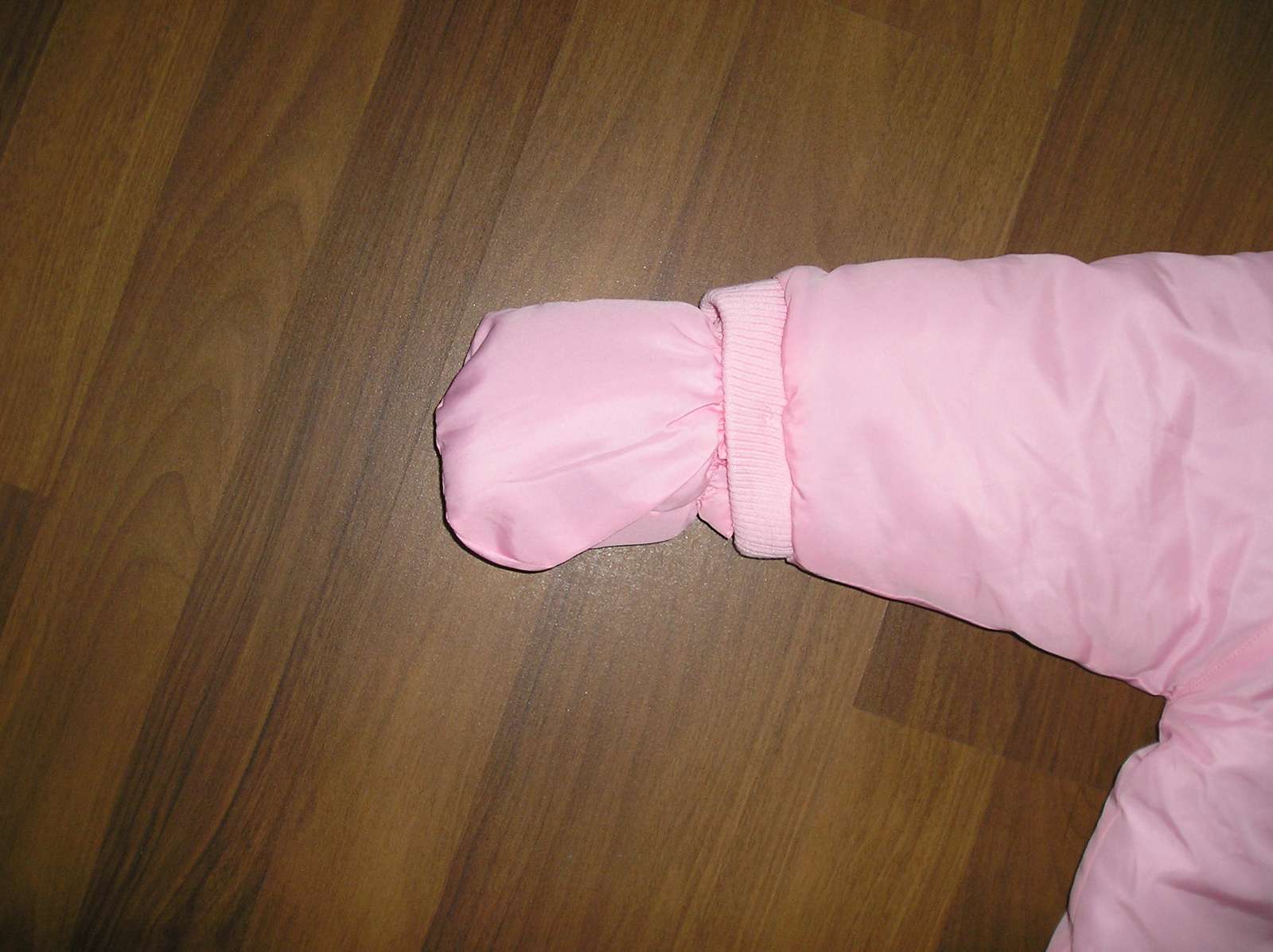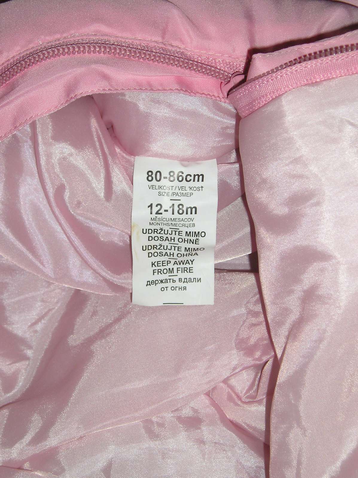 Dievčenský bledoružový overal s kapucňou a rukavicami na rukávoch. Overal sa dá odzipsovať dvoma zipsami. Veľkosť je uvedená 80/86. Na rukávoch sú rukavice, kt. sa dajú odopnúť cez gombík. Použitý len 3 x. Na predku je drobná 1,5 cm škvrna, kt. sa nedá vyprať, už sme to tak kupili. Dĺžka je 74 cm, šírka 43 cm, rukáv s plecom 37 cm.