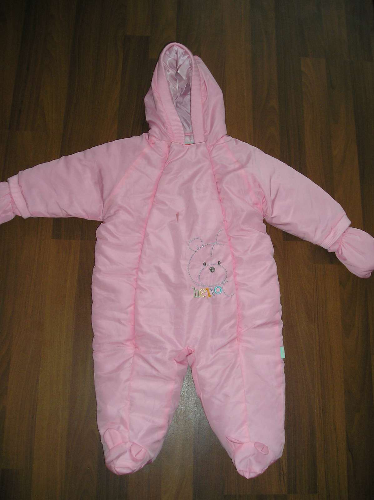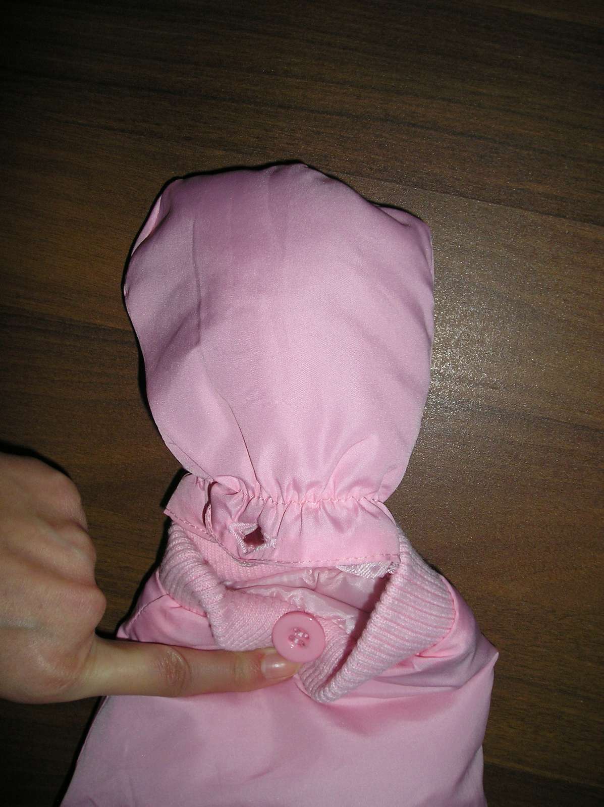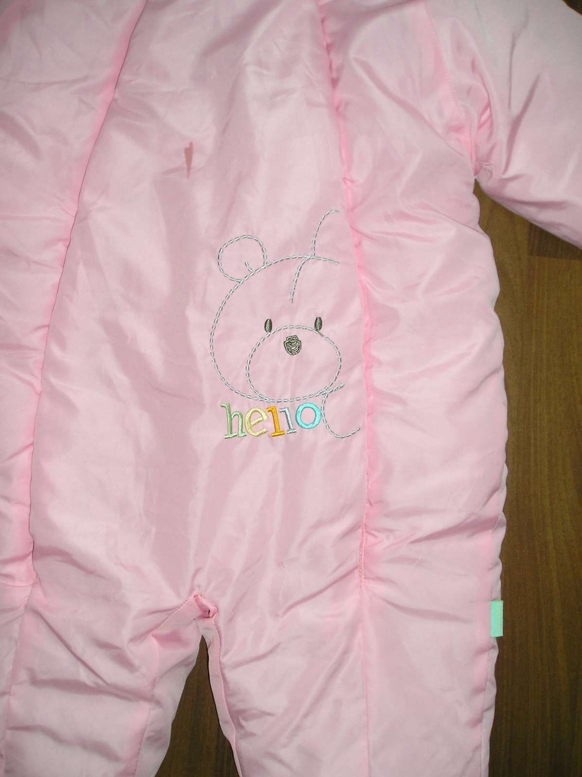 Dievčenský bledoružový overal s kapucňou a rukavicami na rukávoch. Overal sa dá odzipsovať dvoma zipsami. Veľkosť je uvedená 80/86. Na rukávoch sú rukavice, kt. sa dajú odopnúť cez gombík. Použitý len 3 x. Na predku je drobná 1,5 cm škvrna, kt. sa nedá vyprať, už sme to tak kupili. Dĺžka je 74 cm, šírka 43 cm, rukáv s plecom 37 cm.