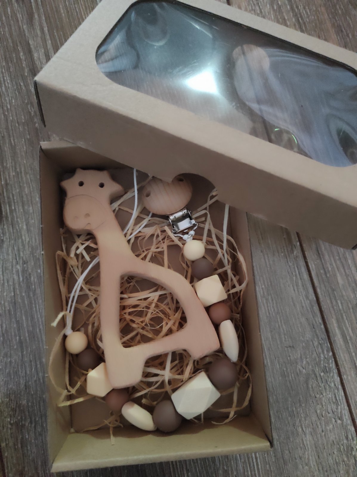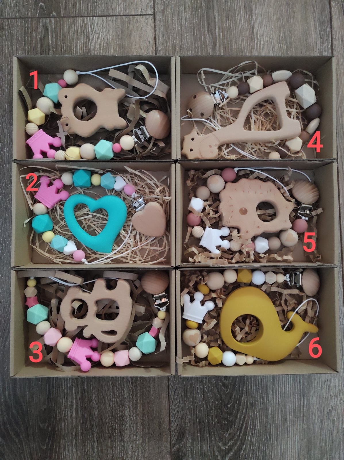 v darcekovej krabicke s okienkom. napiste mi ktore cislo chcete. ak mate zaujem viem vyrobit aj na objednavku. v mojich inzeratoch najdete aj dalsie retiazky na cumlik.