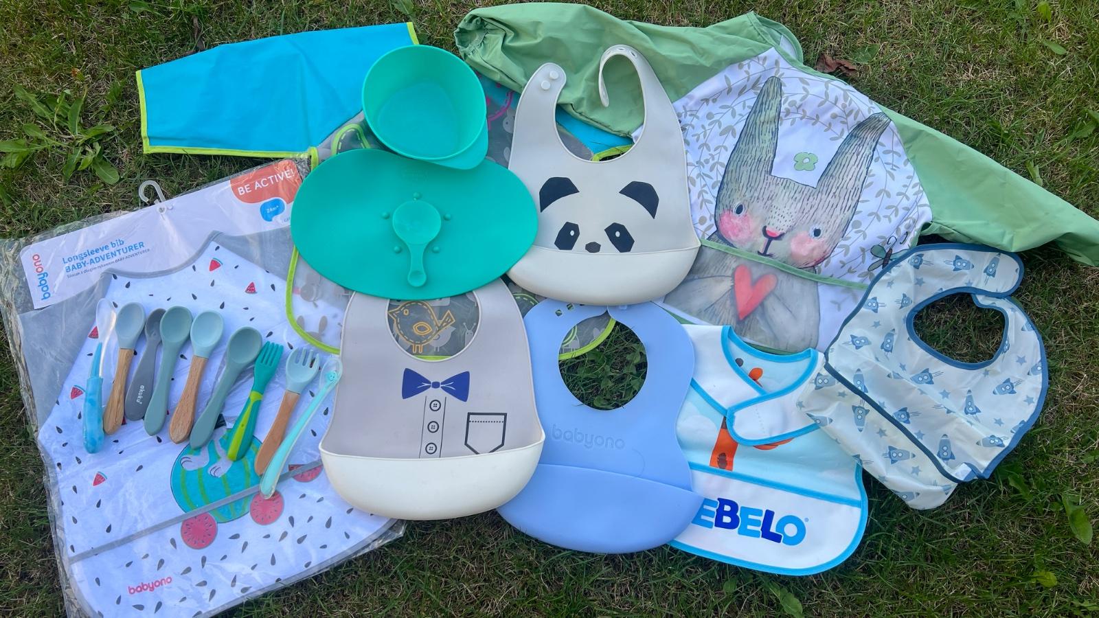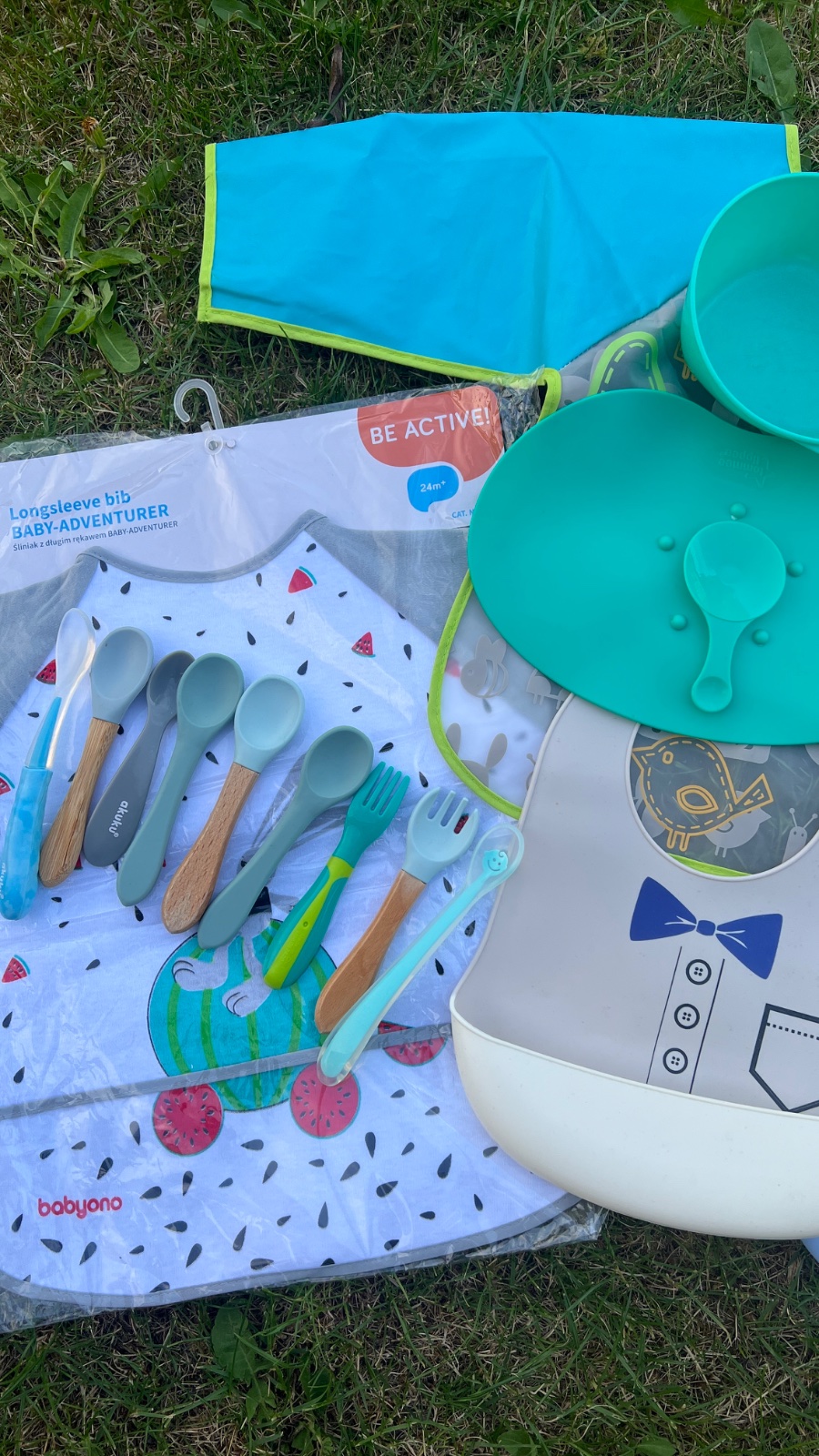 silikonova podlozka TOMMEE TIPPEE a miska. 8ks podradnikov (silikonove, igelitove s rukavmi atd…) a silikonove lyzicky