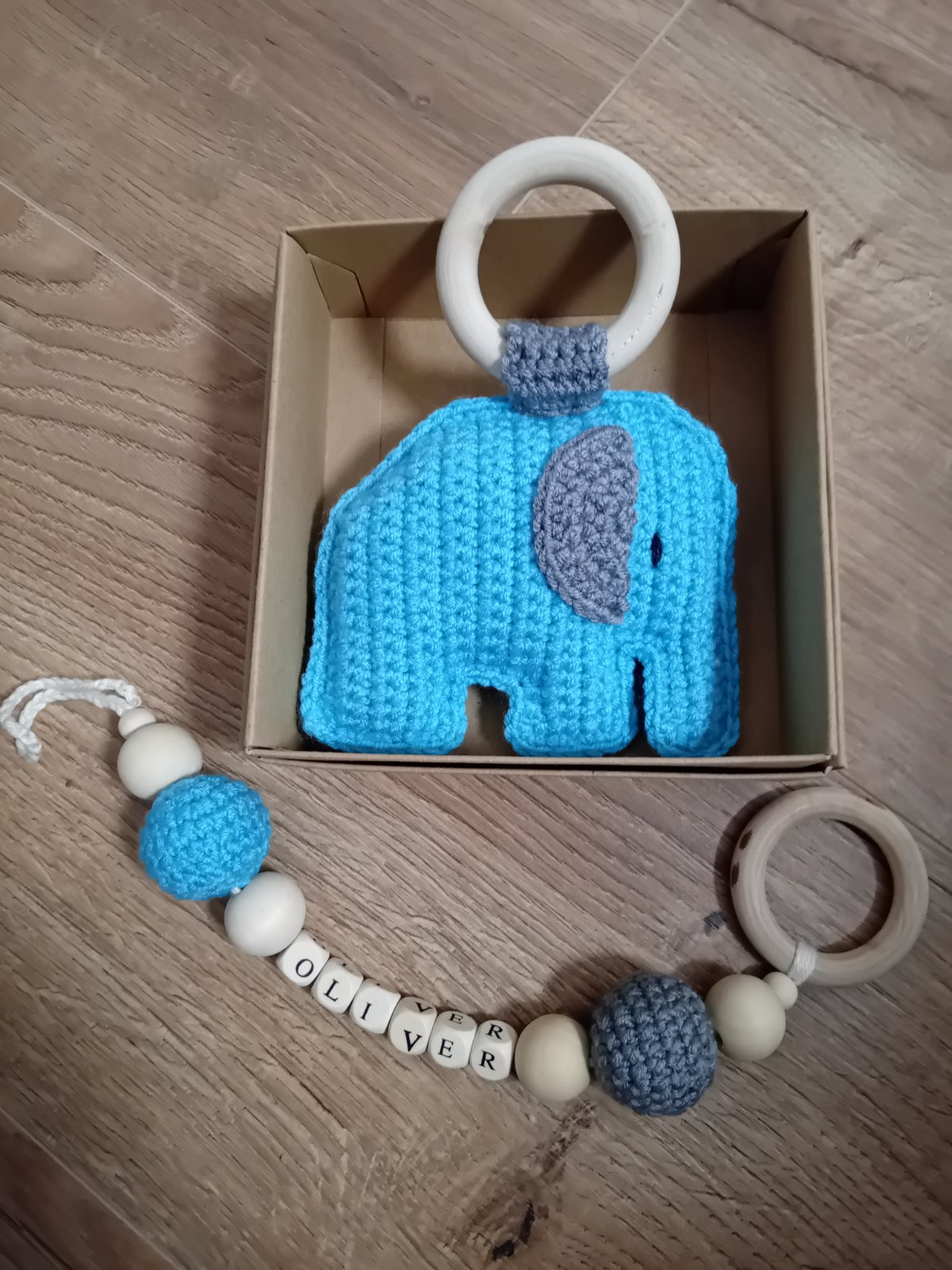 Hačkovany set pre bábätko sa sklada z hrkalky, hryzatka a privesok na cumlík.