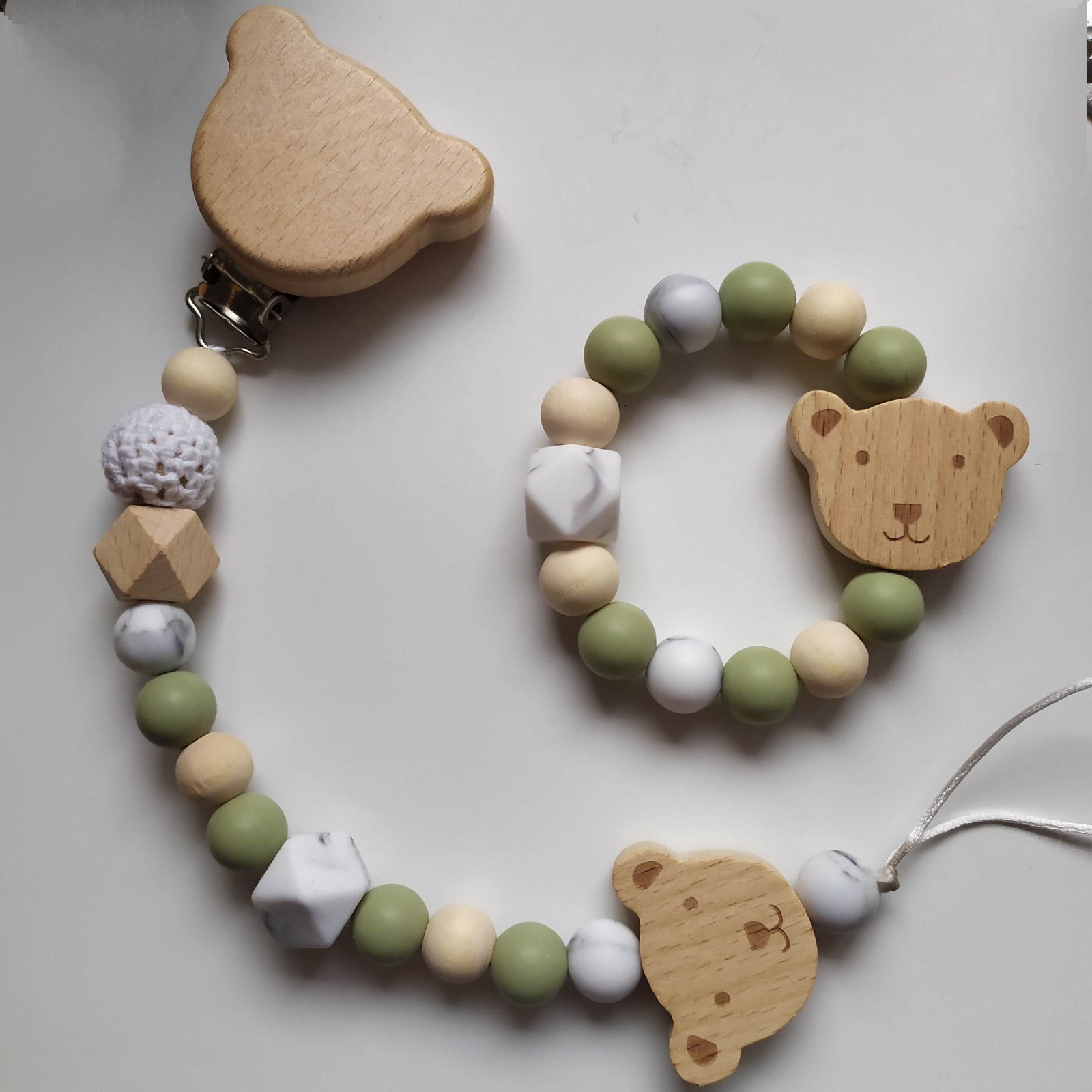 Produkt je vyrobený z dreva a silikónových korálok, ktoré sú vyrobené z certifikovaného potravinárskeho silikónu bez BPA, ftalátov, olova a PVC. Šnúrka je priamo určená na detské hryzadla a príslušenstvo - pevná, certifikovaná bez latexu, nirozamínu, ftalátov, BPA a PVC.