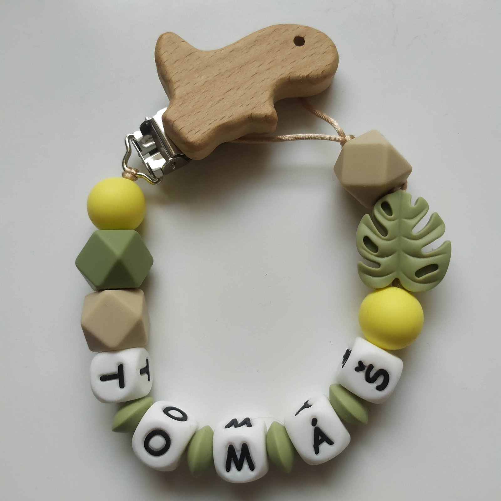 Produkt je vyrobený z dreva a silikónových korálok, ktoré sú vyrobené z certifikovaného potravinárskeho silikónu bez BPA, ftalátov, olova a PVC. Šnúrka je priamo určená na detské hryzadla a príslušenstvo - pevná, certifikovaná bez latexu, nirozamínu, ftalátov, BPA a PVC.