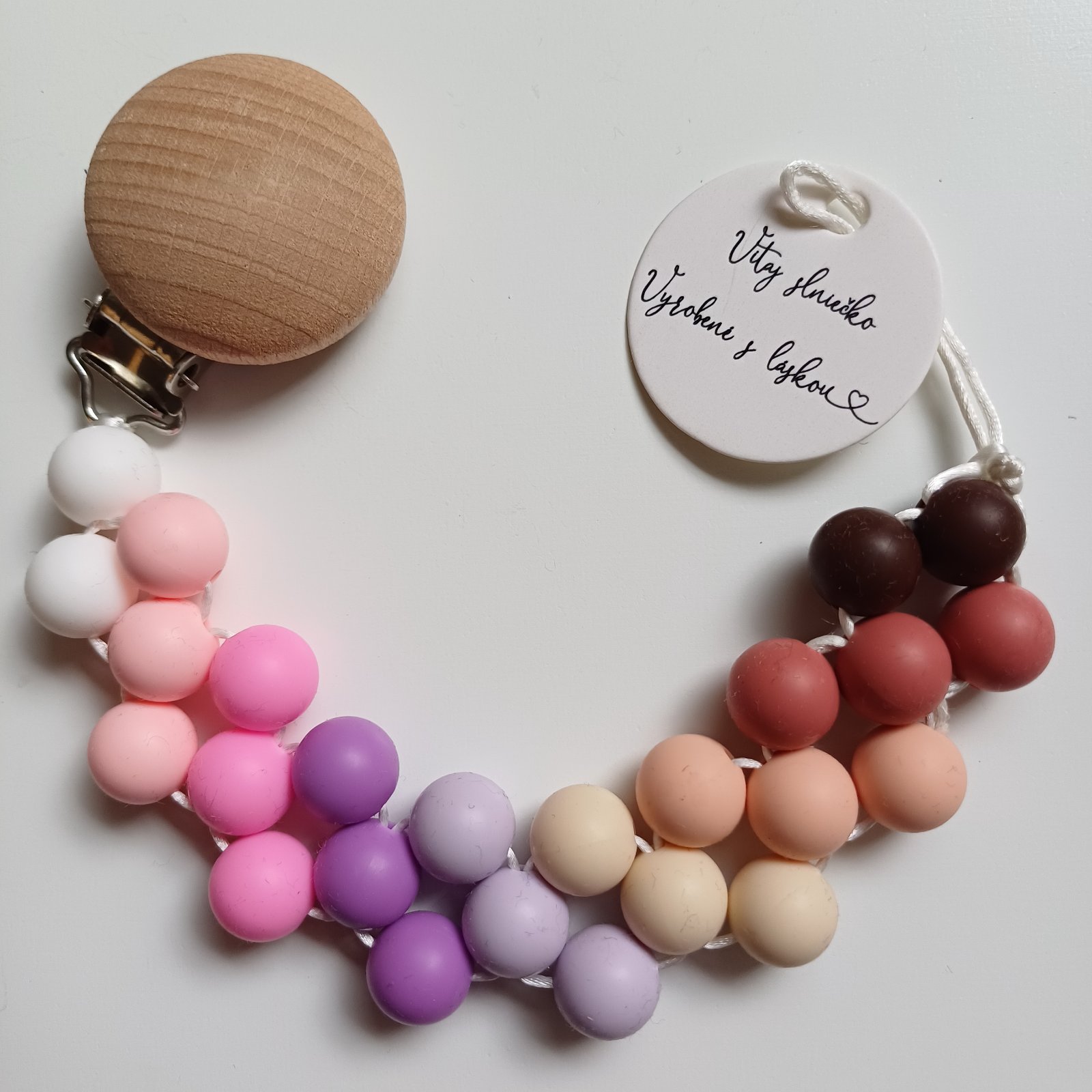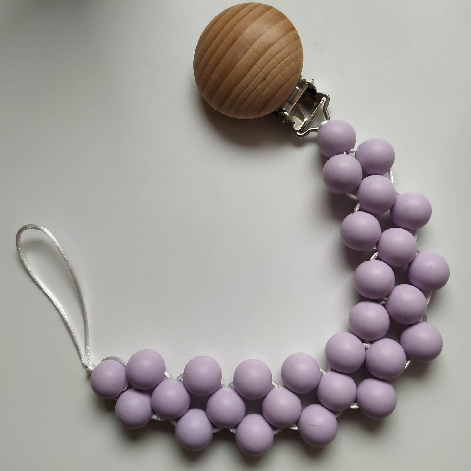 Produkt je vyrobený z dreva a silikónových korálok, ktoré sú vyrobené z certifikovaného potravinárskeho silikónu bez BPA, ftalátov, olova a PVC. Šnúrka je priamo určená na detské hryzadla a príslušenstvo - pevná, certifikovaná bez latexu, nirozamínu, ftalátov, BPA a PVC.