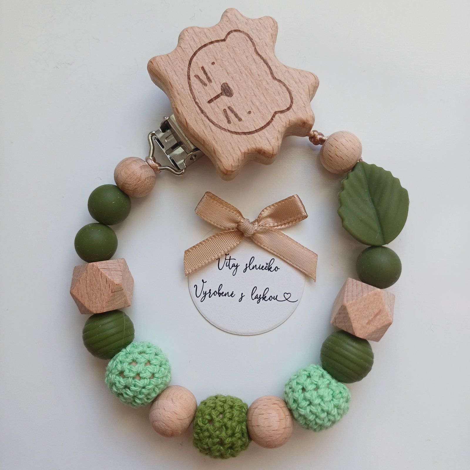 Produkt je vyrobený z dreva a silikónových korálok, ktoré sú vyrobené z certifikovaného potravinárskeho silikónu bez BPA, ftalátov, olova a PVC. Šnúrka je priamo určená na detské hryzadla a príslušenstvo - pevná, certifikovaná bez latexu, nirozamínu, ftalátov, BPA a PVC.