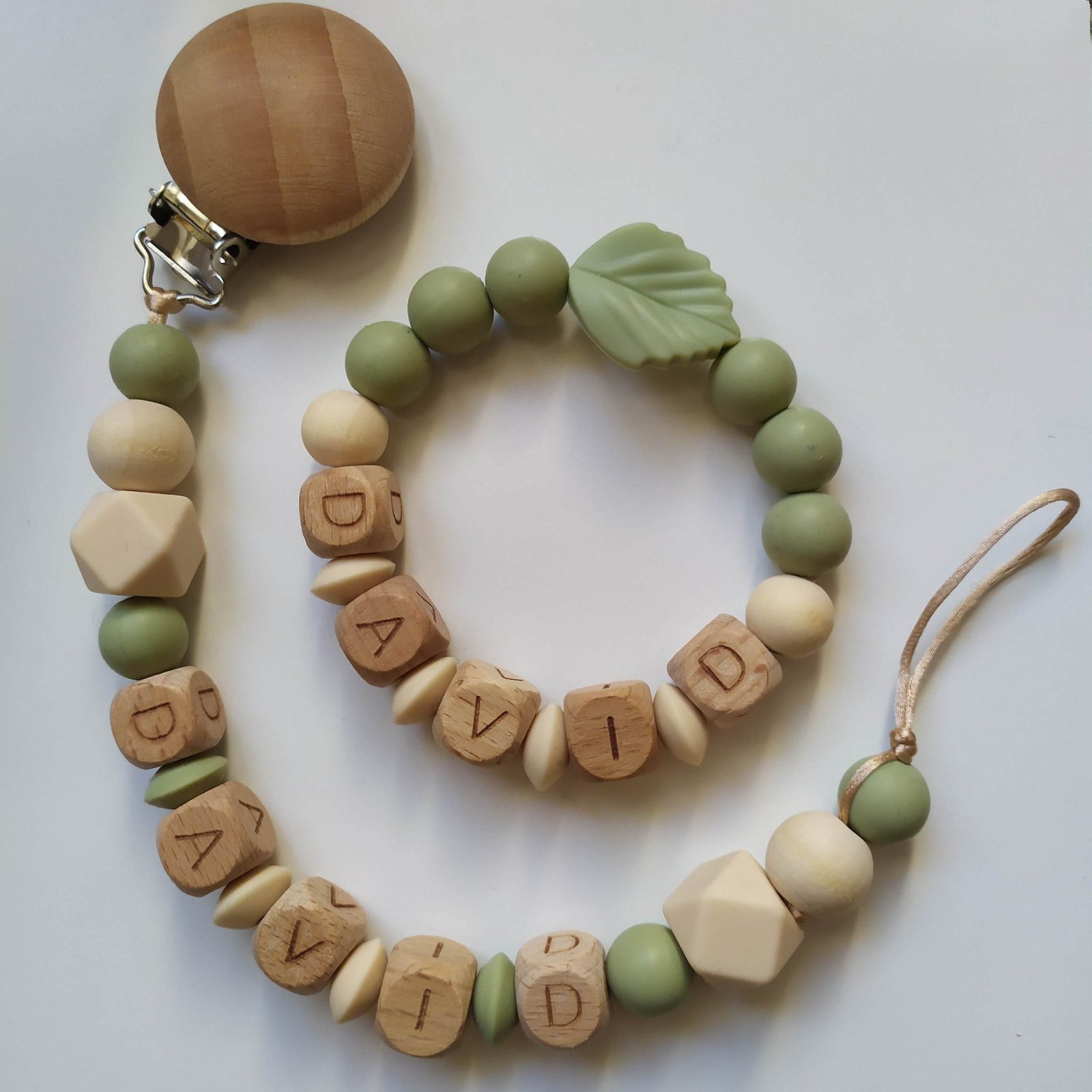 Retiazka na cumlík pre chlapčeka s drevenými písmenkami v zelenej a béžovej farbe a hryzadlo s drevenými písmenami. Set môžem zabaliť do darčekovej krabičky za 1 euro.