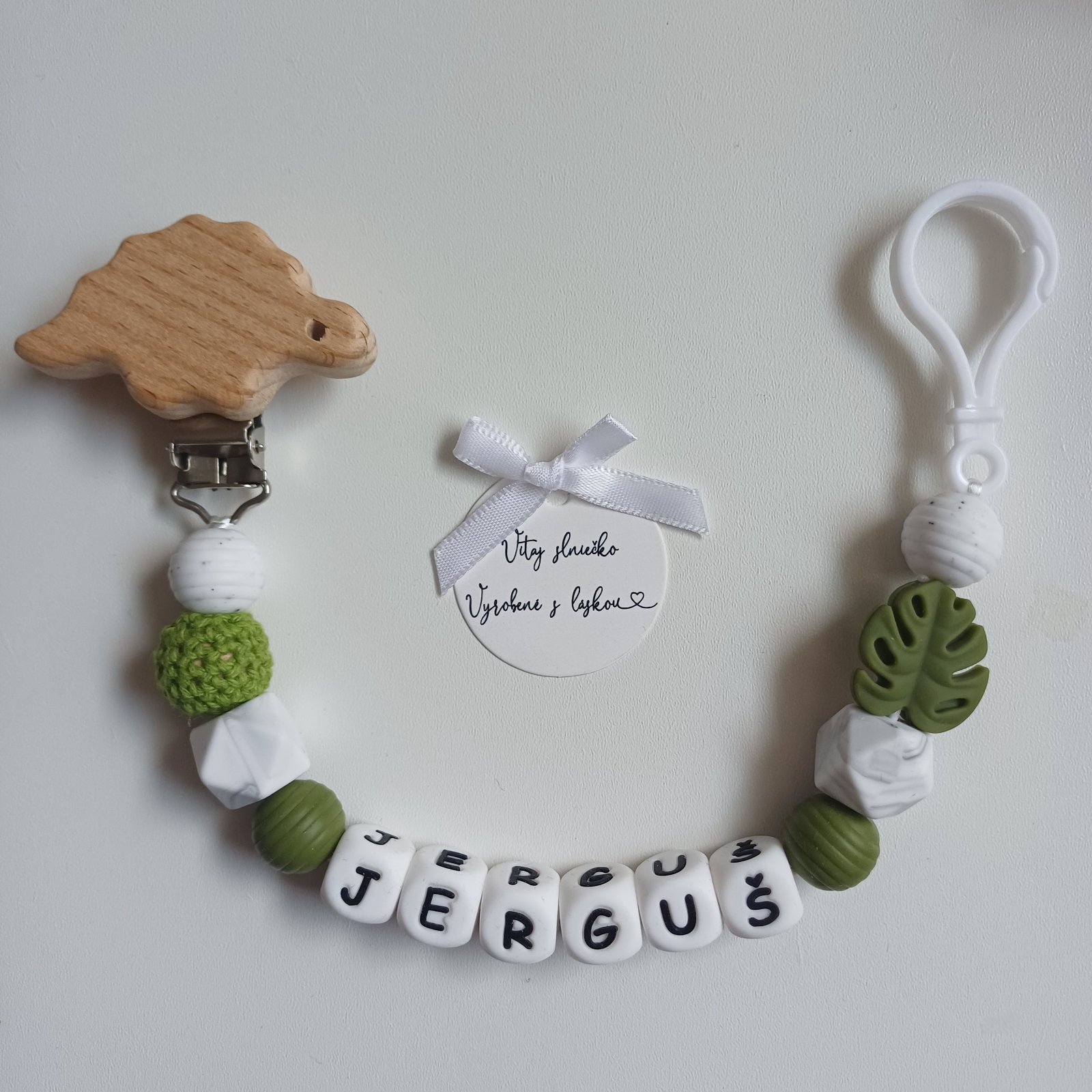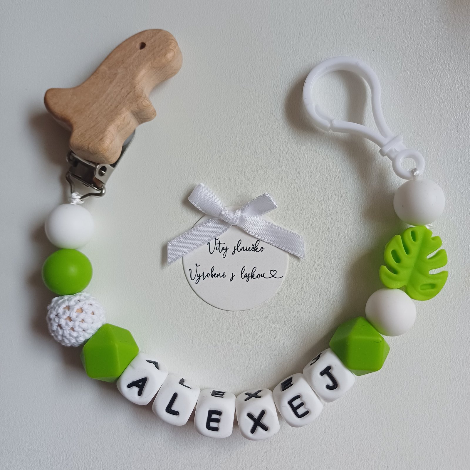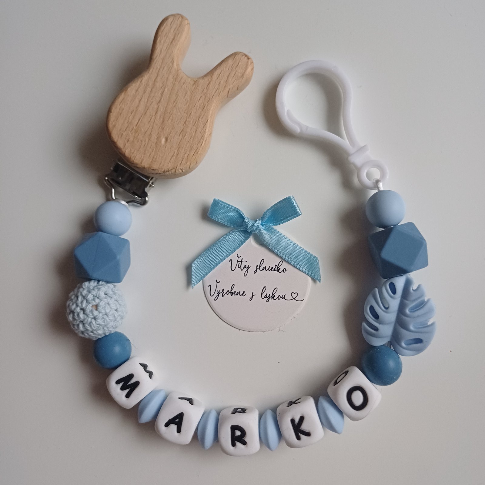 Oznam od predajcu: Klipy na retiazku: Srdiečko, kruh, zajačik, medvedík, sloník, vtáčik, veľryba, autíčko, lev, dinosaurus, stegosaurus, panda, motýľ, motýľ s oblými krídlami, líška, ježko. Dostupné drevené zvieratká na hryzadlo: Macko, zajačik, veľryba, sloník, vtáčik, obláčik, srdiečko, kvet, autíčko, dinosaurus, stegosaurus, žirafa, ježko, zajac, motýľ, hojdací koník, líška, veverička. Ozdoby: Srdiečko, list, balónik, dúha, margarétka, ruža, lev, zebra, slon, žirafa, tiger, koala, líška, autíčko, drevený macko. Dostupné farby: Svetlo modrá, tmavomodrá, zelená, tmavozelená, mätová, staroružová, sýta ružová, lili fialová, marhuľová, bordová, béžová, biela, mramorová, fialová, žltá, slabožltá, oranžová, tmavohnedá. Písmenká v prípade potreby: Drevené (bez diakritiky) alebo silikónové biele s čiernymi písmenkami (aj s diakritikou). Mám aj karabinku na retiazku na cumlík.
