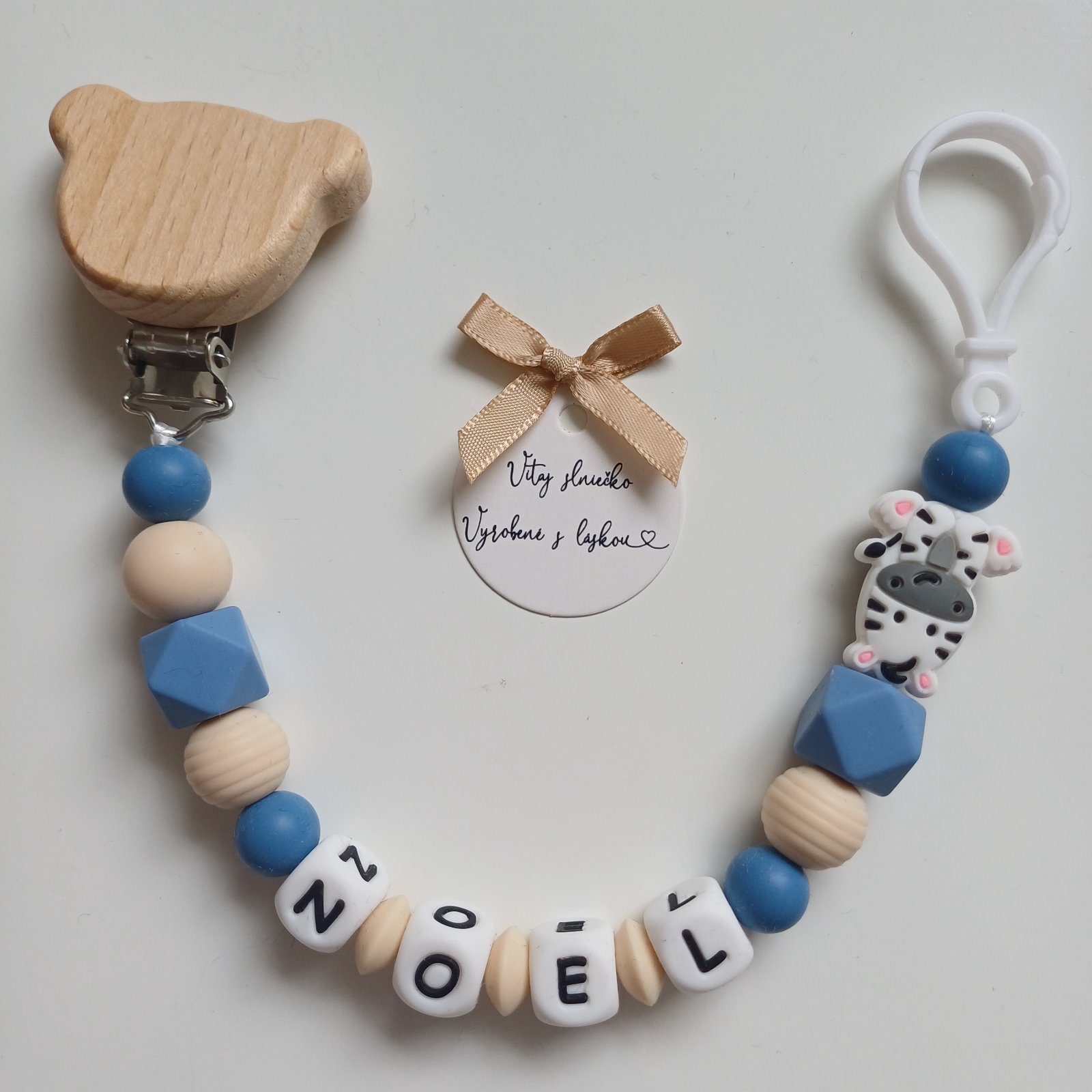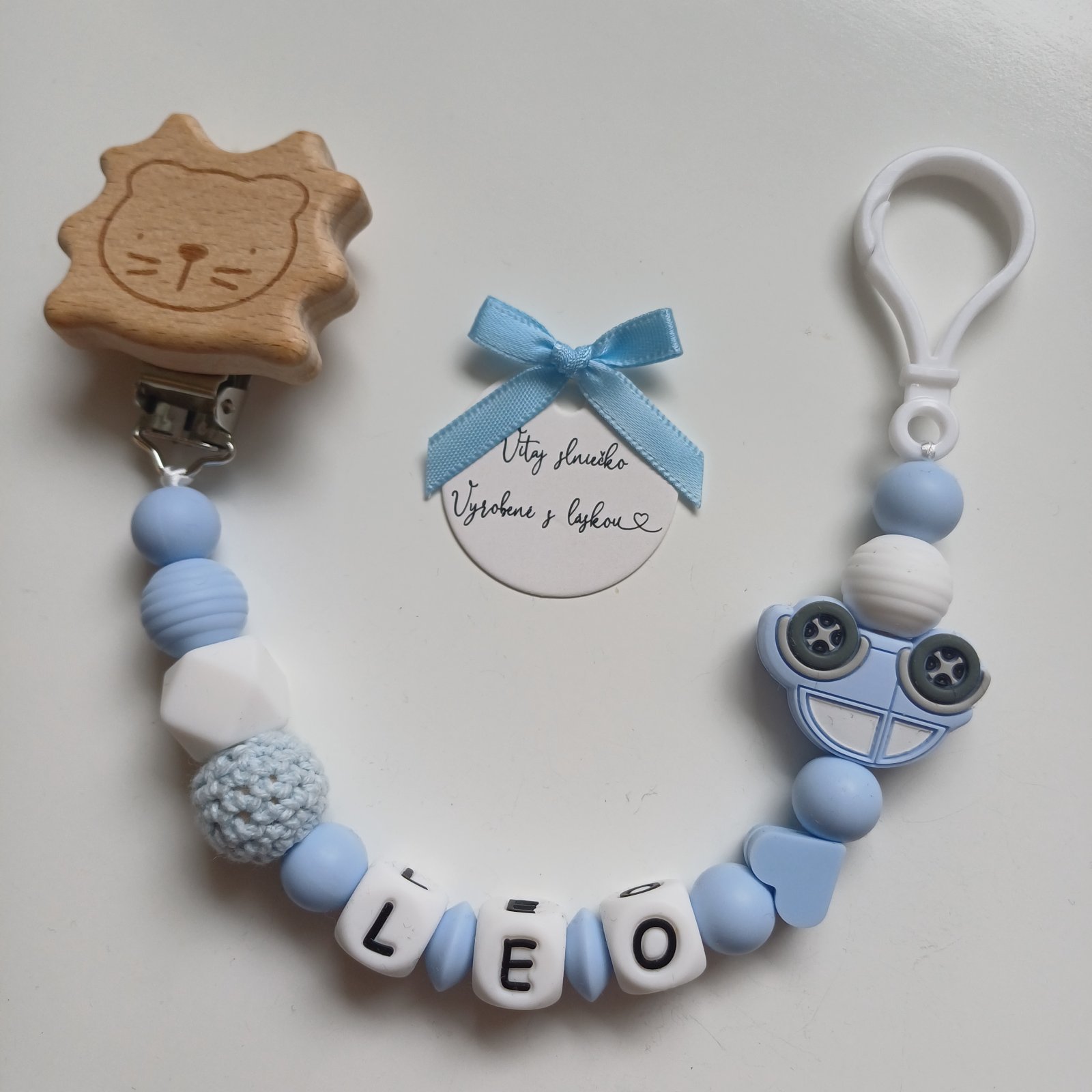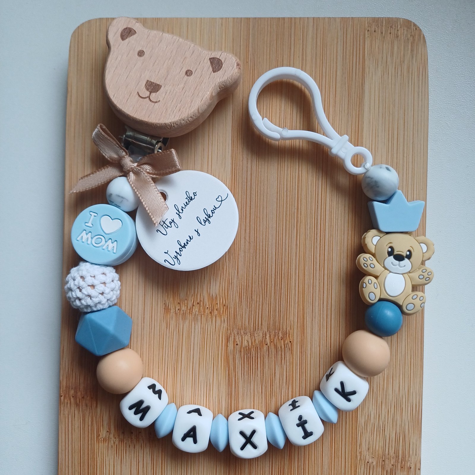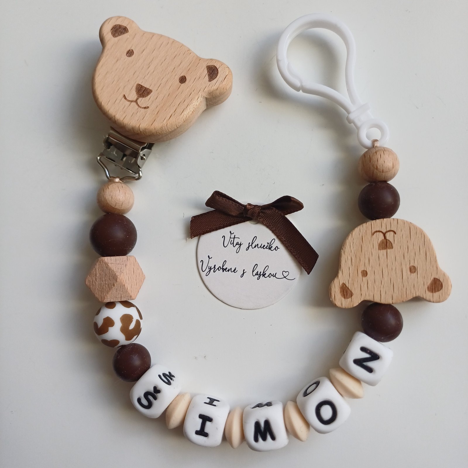 Oznam od predajcu: Klipy na retiazku: Srdiečko, kruh, zajačik, medvedík, sloník, vtáčik, veľryba, autíčko, lev, dinosaurus, stegosaurus, panda, motýľ, motýľ s oblými krídlami, líška, ježko. Dostupné drevené zvieratká na hryzadlo: Macko, zajačik, veľryba, sloník, vtáčik, obláčik, srdiečko, kvet, autíčko, dinosaurus, stegosaurus, žirafa, ježko, zajac, motýľ, hojdací koník, líška, veverička. Ozdoby: Srdiečko, list, balónik, dúha, margarétka, ruža, lev, zebra, slon, žirafa, tiger, koala, líška, autíčko, drevený macko. Dostupné farby: Svetlo modrá, tmavomodrá, zelená, tmavozelená, mätová, staroružová, sýta ružová, lili fialová, marhuľová, bordová, béžová, biela, mramorová, fialová, žltá, slabožltá, oranžová, tmavohnedá. Písmenká v prípade potreby: Drevené (bez diakritiky) alebo silikónové biele s čiernymi písmenkami (aj s diakritikou). Mám aj karabinku na retiazku na cumlík.