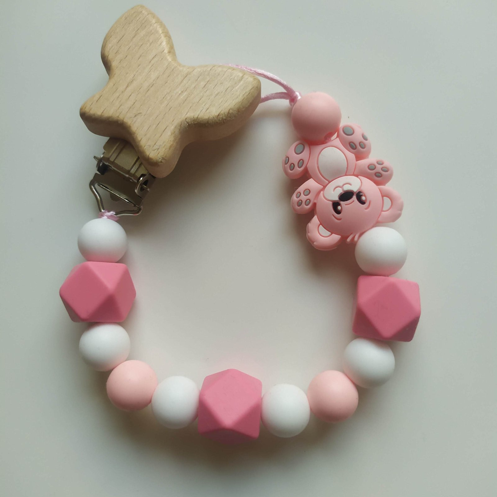 Produkt je vyrobený z dreva a silikónových korálok, ktoré sú vyrobené z certifikovaného potravinárskeho silikónu bez BPA, ftalátov, olova a PVC. Šnúrka je priamo určená na detské hryzadla a príslušenstvo - pevná, certifikovaná bez latexu, nirozamínu, ftalátov, BPA a PVC.