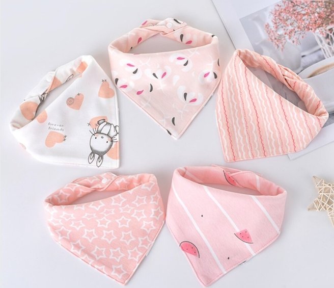 4 ks/sada detské podbradníky trojuholníkové dvojité bavlnené vhodné pre chlapčekov a dievčatá, látkové detské uteráky na sliny, farba do ružova, textilná hrkálka. Podbradníky sú nové, nepoužívané.