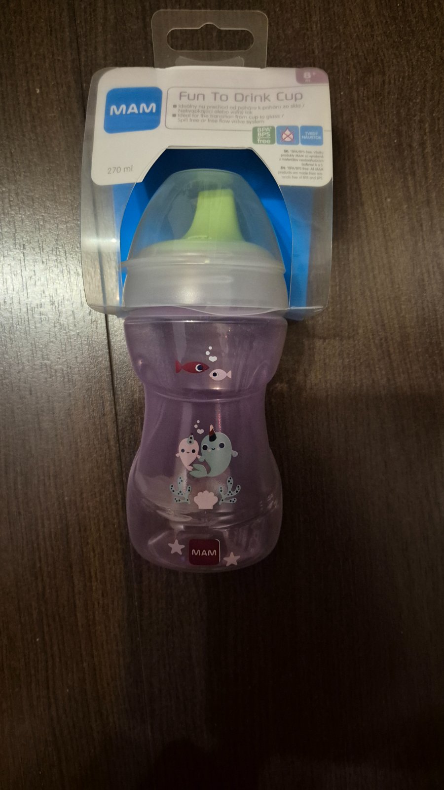 Od 8 mesiacov, 270 ml. My sme ju párkrát vyskúšali, takže náustok má trošku ryhy od zubov. Inak ako nová, vysterilizovaná parným sterilizátorom.