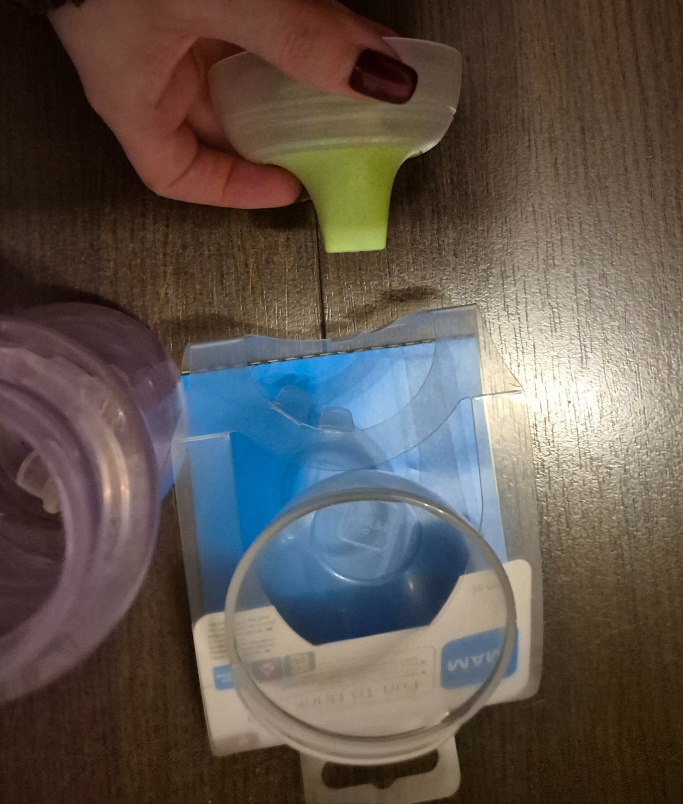 Tri fľaše, dva montované zospodu konkrétne tie na kraji vysoká ružová a malá sivá. V strede veľká sivá je v celku, spodok sa rozmontovat nedá. Dva vrchnáky a jeden obmedzovač a jeden cumlík jednot...