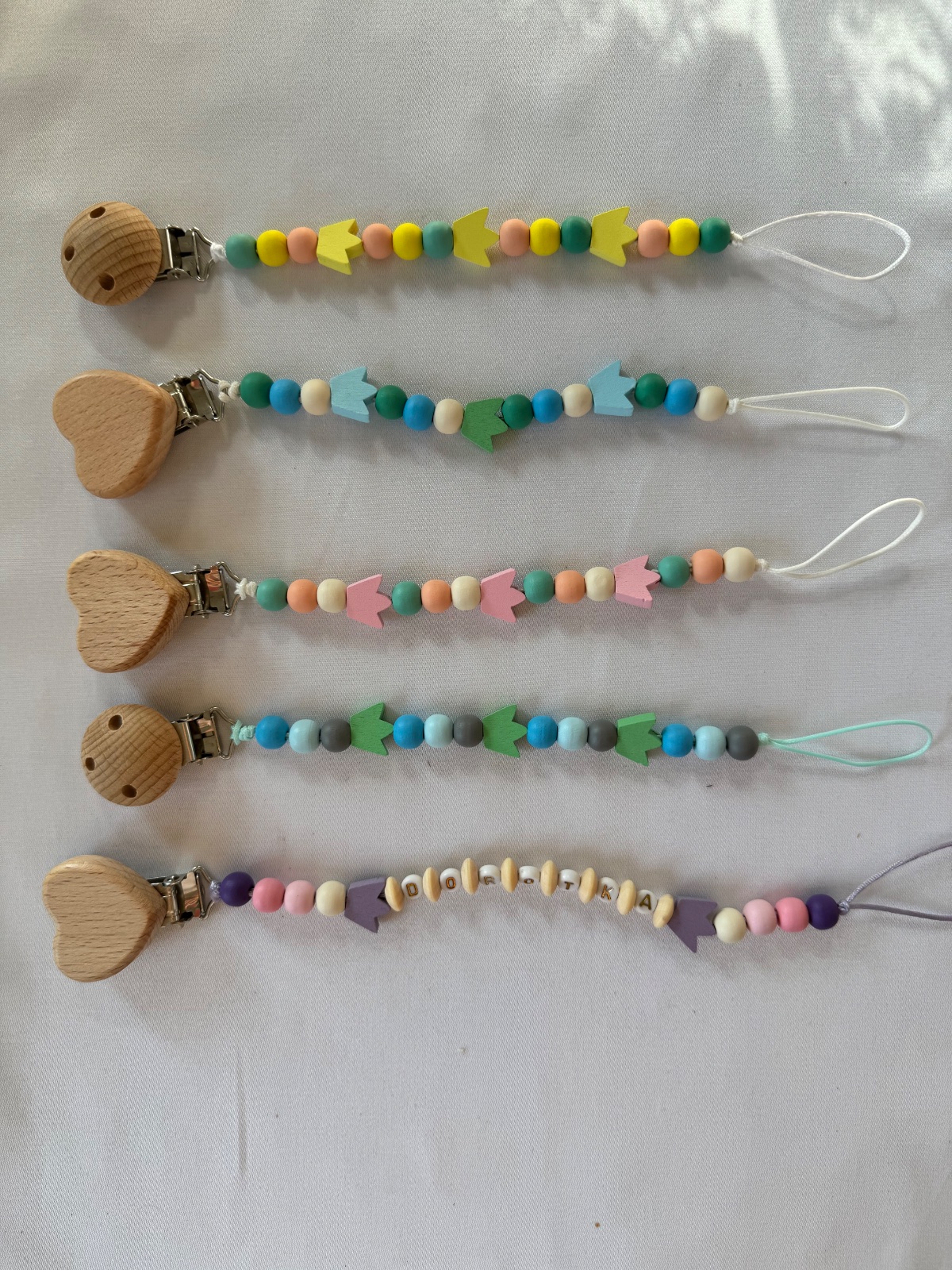 Hand-made retiazka na cumlík s menom dieťatka, s dreveným klipom na uchytenie na oblečenie, vhodná pre dievča, vyrobená zo silikónových a akrylových korálok.
