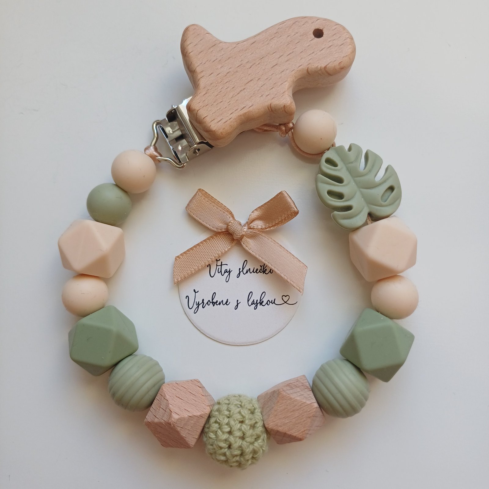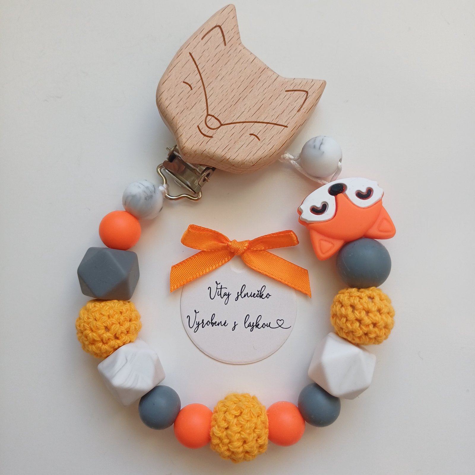 Oznam od predajcu: Klipy na retiazku: Srdiečko, kruh, zajačik, medvedík, sloník, vtáčik, veľryba, autíčko, lev, dinosaurus, stegosaurus, panda, motýľ, motýľ s oblými krídlami, líška, ježko. Dostupné drevené zvieratká na hryzadlo: Macko, zajačik, veľryba, sloník, vtáčik, obláčik, srdiečko, kvet, autíčko, dinosaurus, stegosaurus, žirafa, ježko, zajac, motýľ, hojdací koník, líška, veverička. Ozdoby: Srdiečko, list, balónik, dúha, margarétka, ruža, lev, zebra, slon, žirafa, tiger, koala, líška, autíčko, drevený macko. Dostupné farby: Svetlo modrá, tmavomodrá, zelená, tmavozelená, mätová, staroružová, sýta ružová, lili fialová, marhuľová, bordová, béžová, biela, mramorová, fialová, žltá, slabožltá, oranžová, tmavohnedá. Písmenká v prípade potreby: Drevené (bez diakritiky) alebo silikónové biele s čiernymi písmenkami (aj s diakritikou). Mám aj karabinku na retiazku na cumlík.