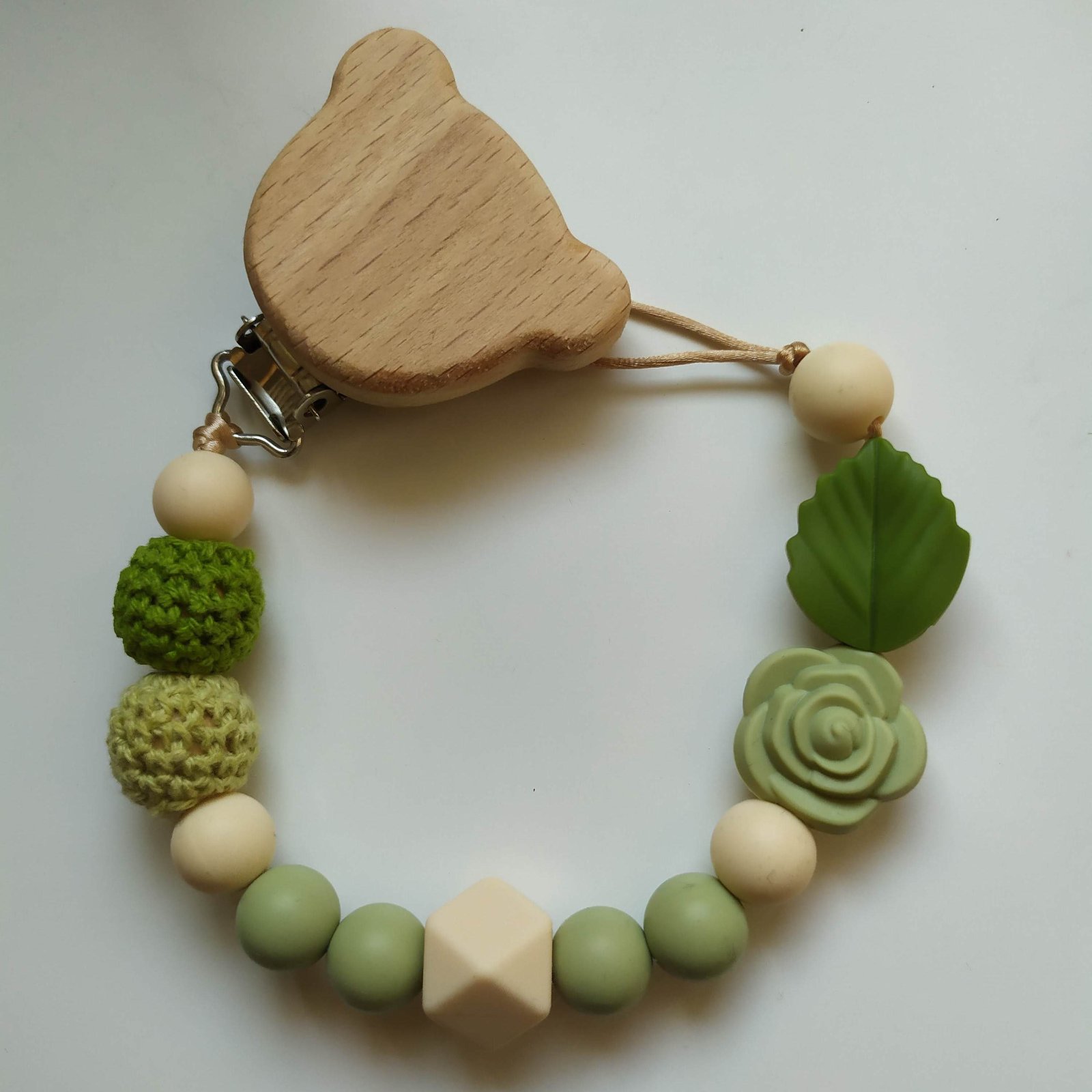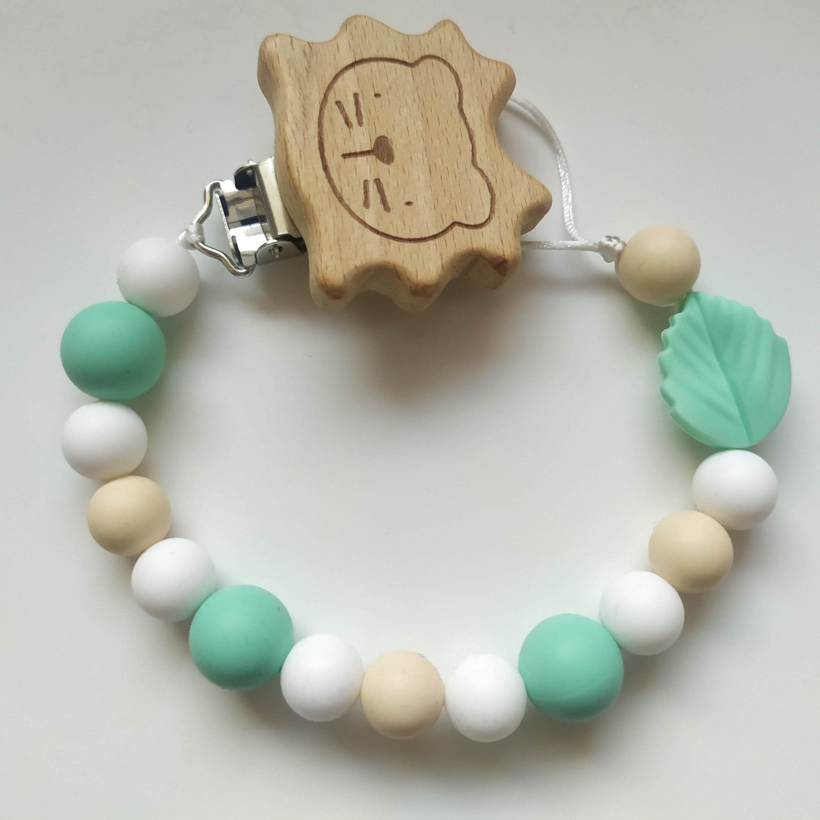 Produkt je vyrobený z dreva a silikónových korálok, ktoré sú vyrobené z certifikovaného potravinárskeho silikónu bez BPA, ftalátov, olova a PVC. Šnúrka je priamo určená na detské hryzadla a príslušenstvo - pevná, certifikovaná bez latexu, nirozamínu, ftalátov, BPA a PVC.