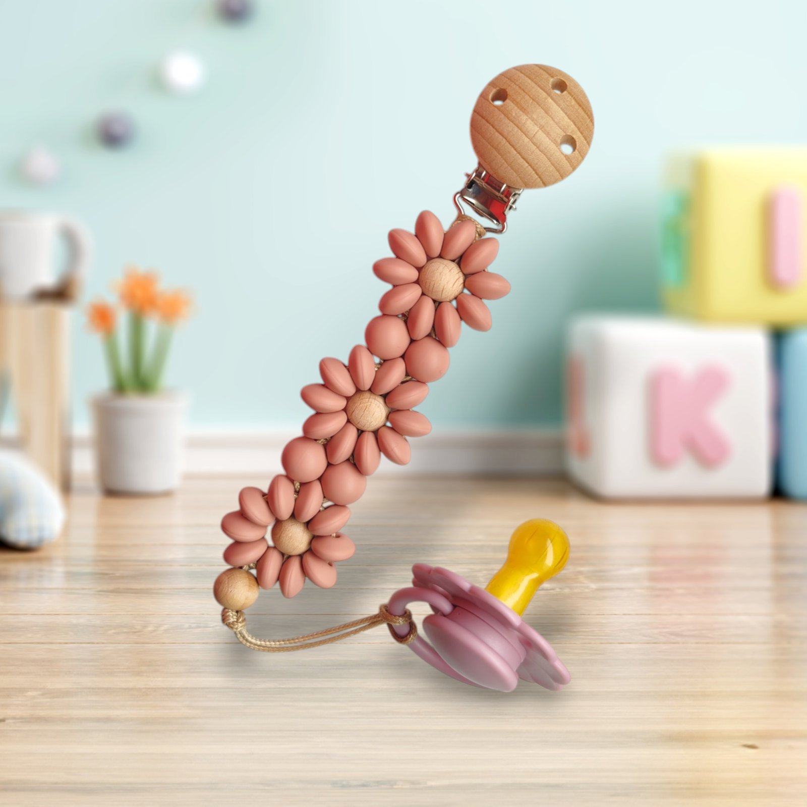Hand-made kvetinková retiazka na cumlík, s dreveným klipom na uchytenie na oblečenie, vhodná pre dievča, vyrobená zo silikónových a drevených korálok.