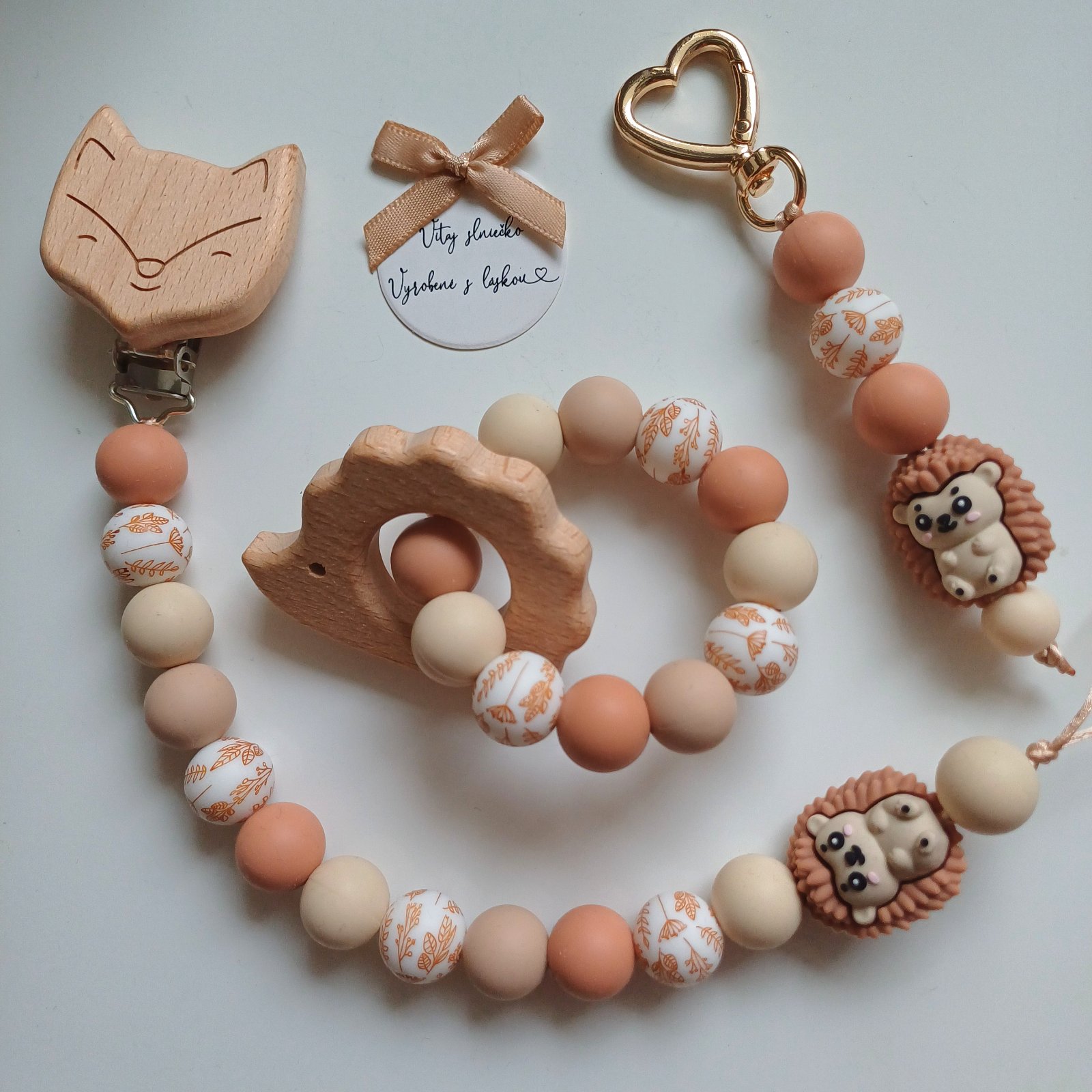🦊 Retiazku na cumlík bez mena – s väčšími guličkami pre príjemné držanie, doplnenú o krásne guličky s lístkovým vzorom.