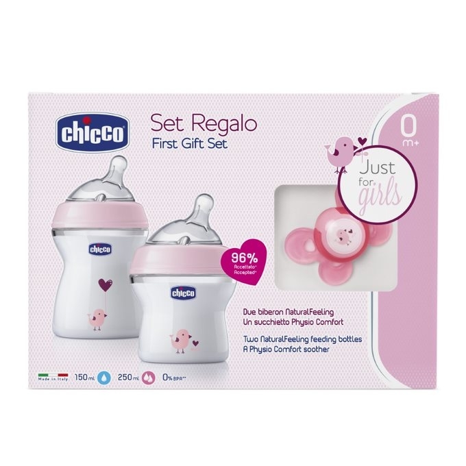 SkladomSada obsahuje kultové produkty značky Chicco, ktoré budú tým najvhodnejším darčekom pre malé dievčatko. Sada obsahuje 2 kojenecké fľaše z línie Natural Feeling s objemom 150 a 250 ml s normálnym prietokom a nový fyziologický ortodontický cumlík 0-2 mes.Línia kojeneckých fliaš Natural Feeling je navrhnutá tak, aby čo najviac pripomínala prirodzené kojenie . Zahnutý tvar cumlíka s jemnou úpravou "mum efect" napodobňuje prsník a umožňuje kŕmenie v čo najprirodzenejšej polohe.