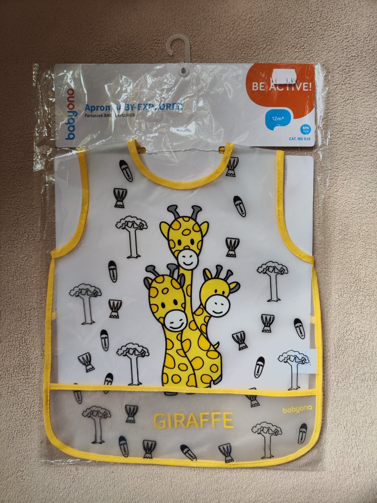 Nepremokavý, dlhý, s vreckom na zachytenie tekutín alebo zvyškov jedla. Môže slúžiť aj ako pláštenka pre malých umelcov