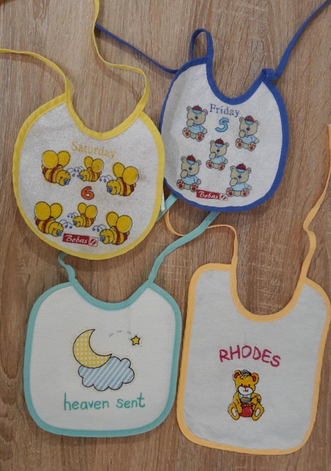 predam nepremokave podbradniky zlty zo vcielkami ma par fliacikov ostatne bez flakov,a zlty z mackom ma na boku na folie popukane.cena za vsetky