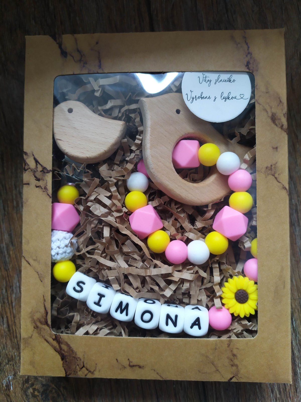Retiazka na cumlík s vtáčikom pre dievčatko so silikónovými písmenkami v ružovej a žltej farbe a hryzadlo s dreveným vtáčikom. Set môžem zabaliť do darčekovej krabičky za 1 euro.