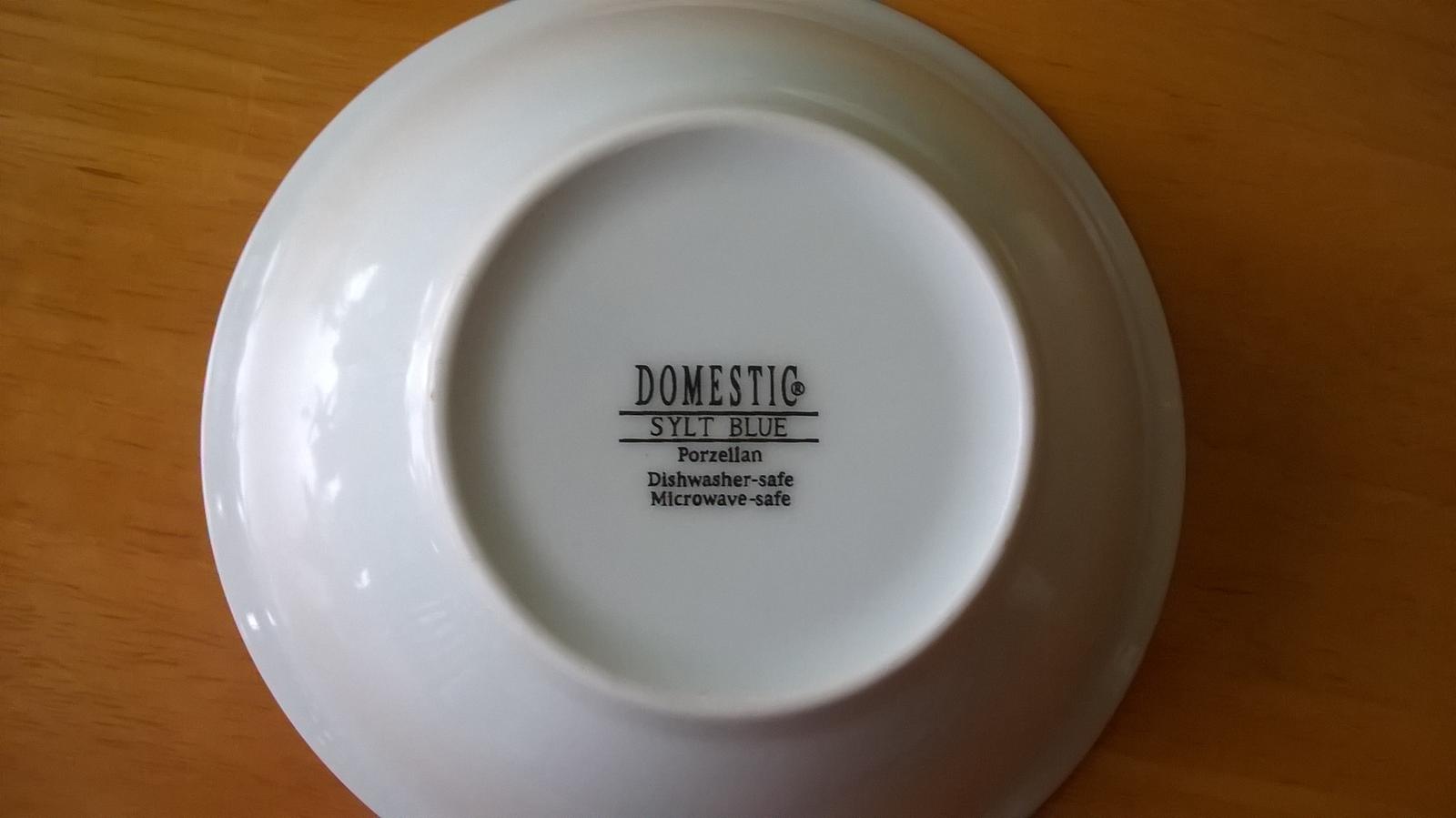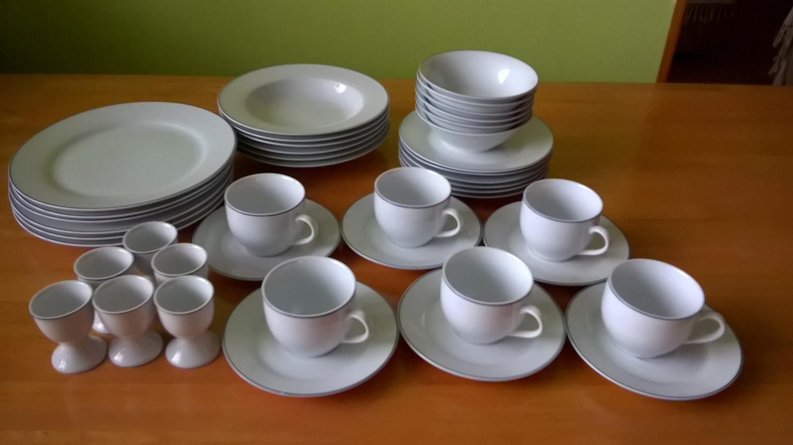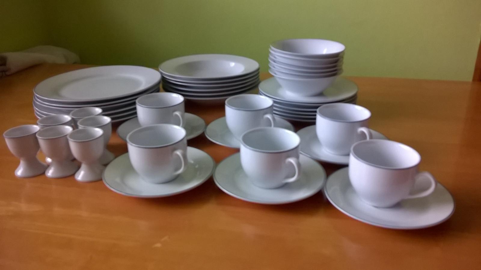 Obedová súprava s modrým prúžkom po okraji. Takmer nepoužívané (niektoré vôbec), bez závad, bez škrabancov. Súprava obsahuje po 6 ks tanier hlboký, plytký, dezertný, šálka s podšálkou, miska na kompót, stojan na vajíčka.