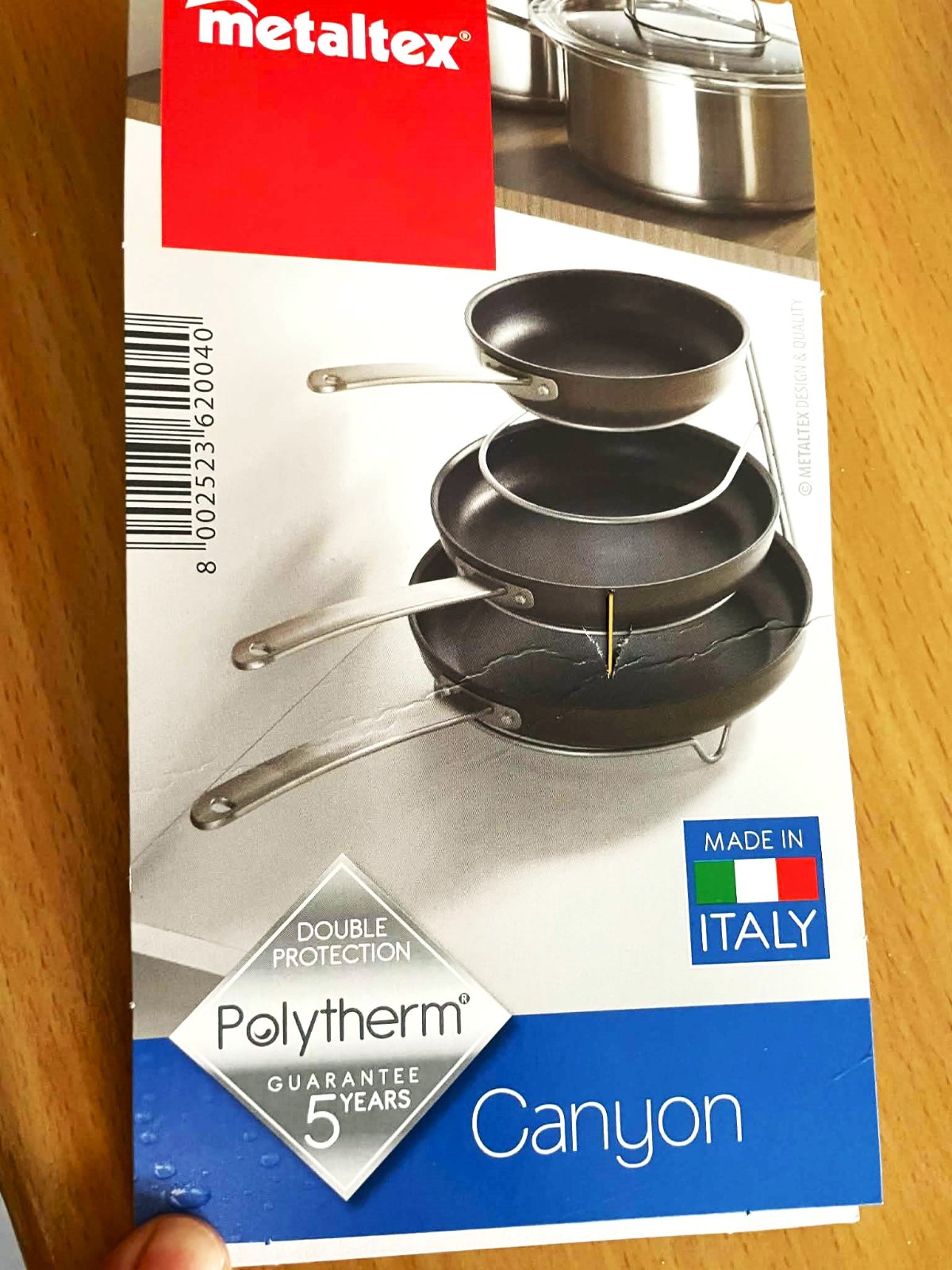 veľmi kvalitný organizér z kvalitnej ušľachtilej pevnej chrómovanej ocele,na ukladanie - stohovanie panvíc do linky alebo do špajze,temer nepoužívaný,veľmi praktický pomocník....