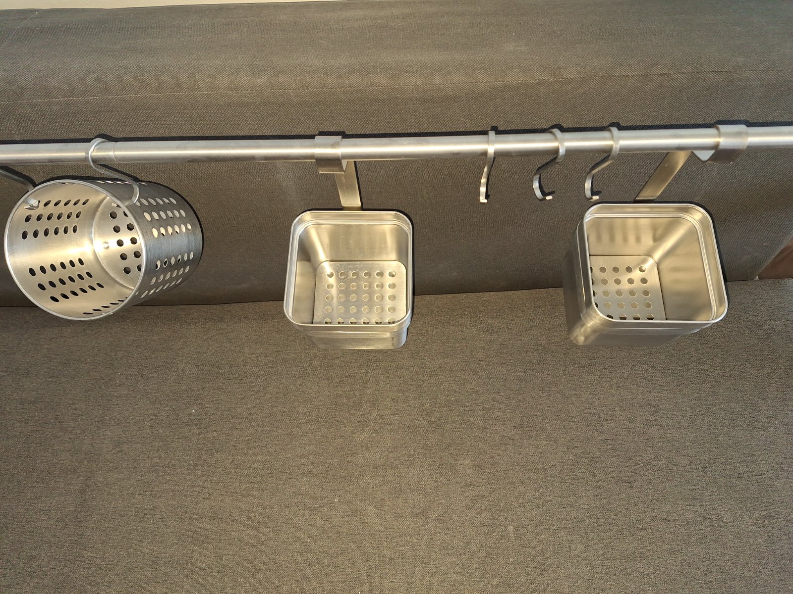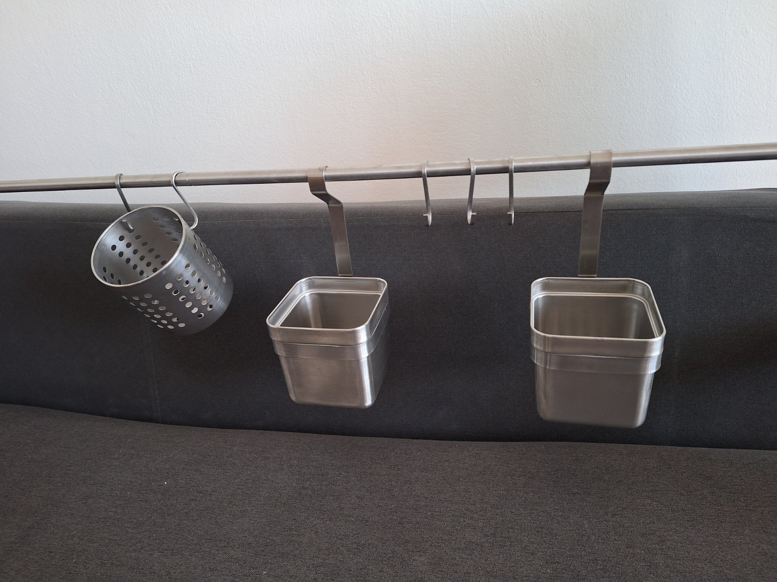 Poskytne v kuchyni ďalší odkladací priestor. Háky 5ks, dózy 3ks, polica 1ks, koľajnička 112cm, zn. IKEA. Šetrí priestor na kuchynskej linke. Top stav