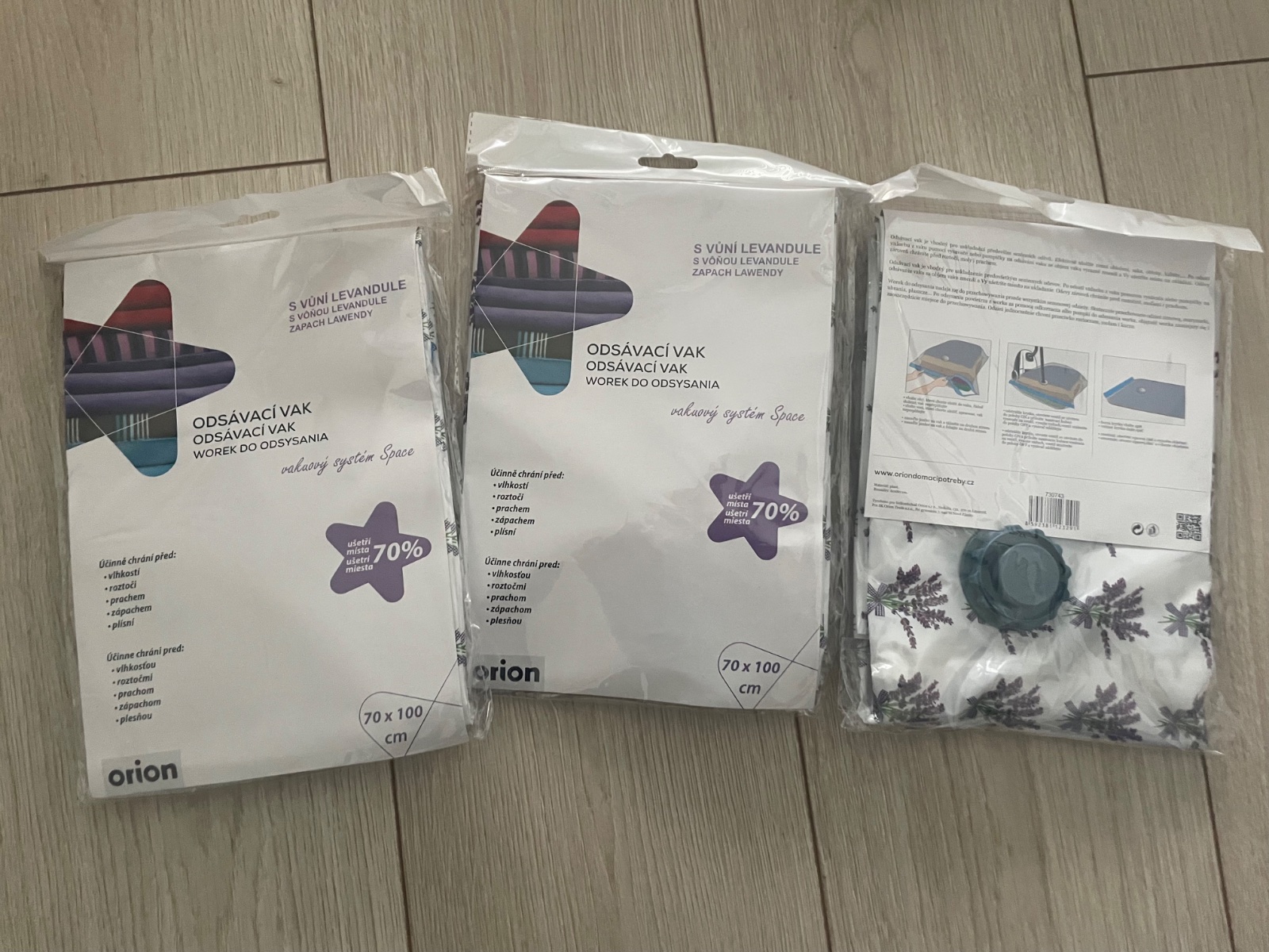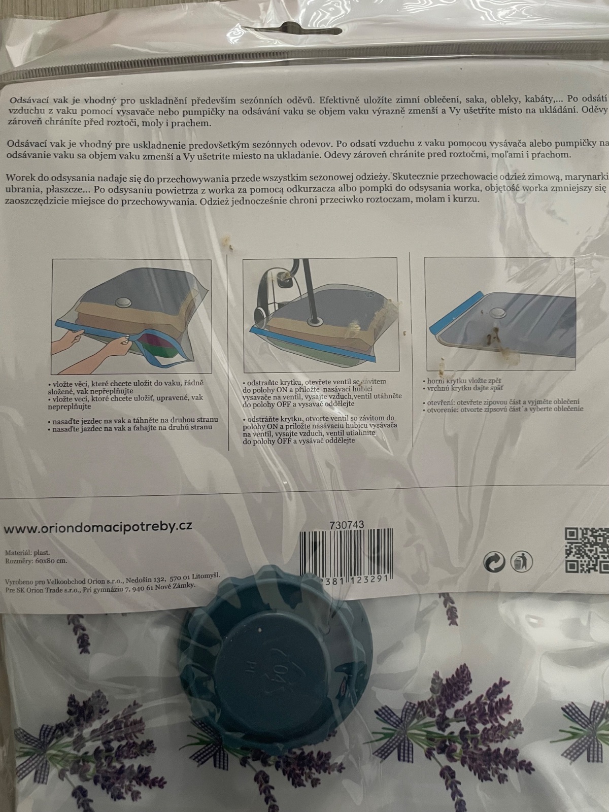 Skvelým pomocníkom do domácnosti sa stane vákuové vrece so vzorom levandule, ktoré je vhodné na uskladnenie sezónnych odevov, lôžkovín, textilných i plyšových hračiek. Na odsatie prebytočného vzduchu použite vysávač alebo špeciálnu pumpičku. Po odsatí sa objem vaku zmenší a Vy ušetríte miesto na ukladanie. Vákuové vrece ochráni uložené odevy pred roztočmi, moľami i prachom, odsávač je parfumovaný vôňou LEVANDUĽA. Cena za kus