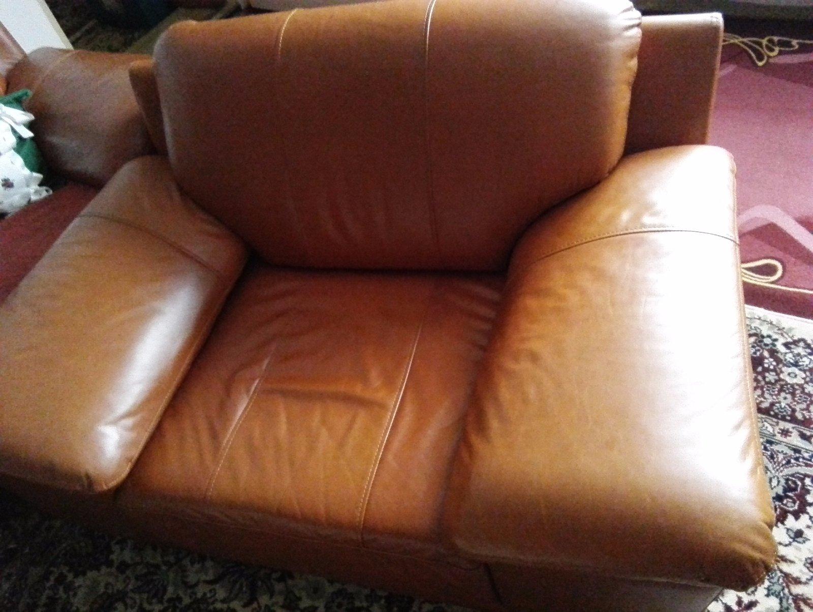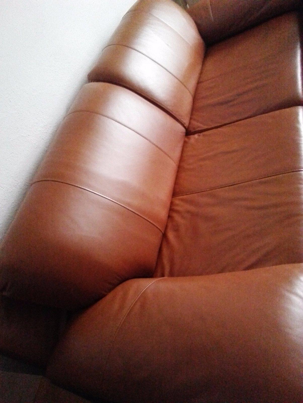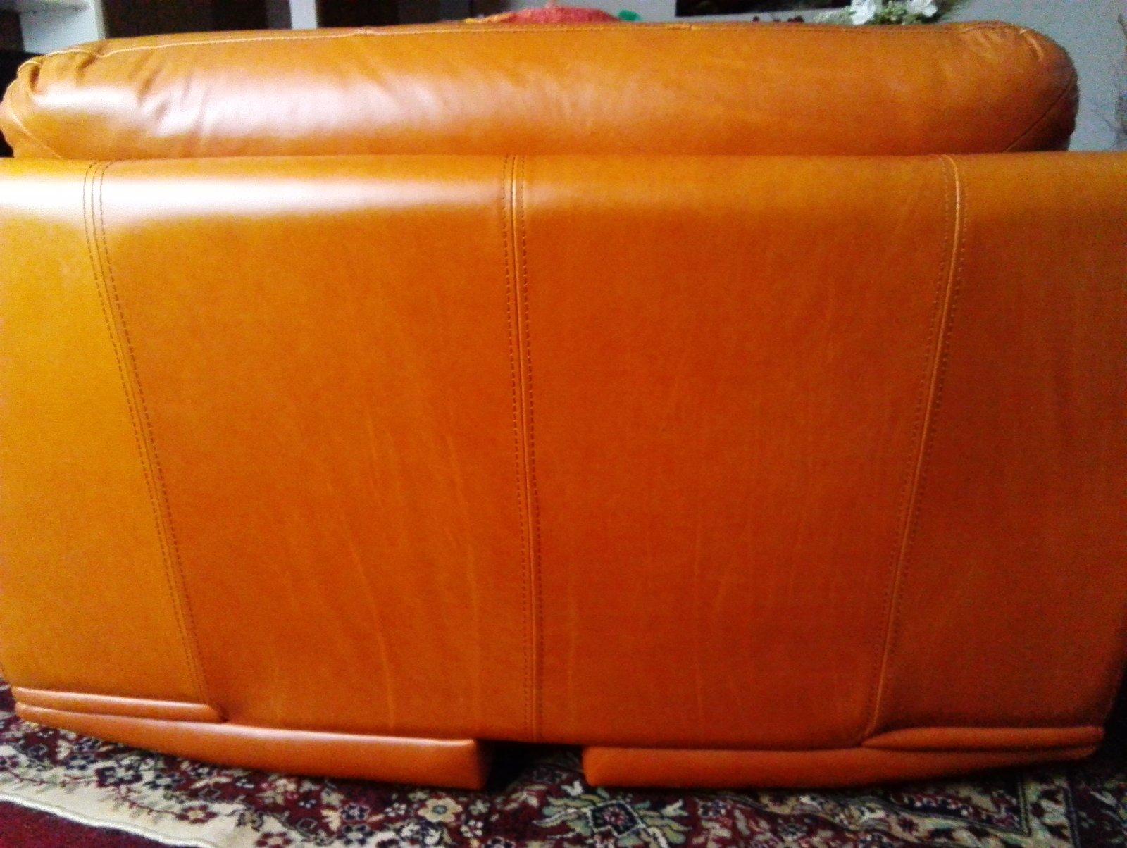 Sedacka v super stave, dve jednotky a jedna trojka, mohutne. Vhodne do velkeho priestoru, kozena, tmavy oranz.