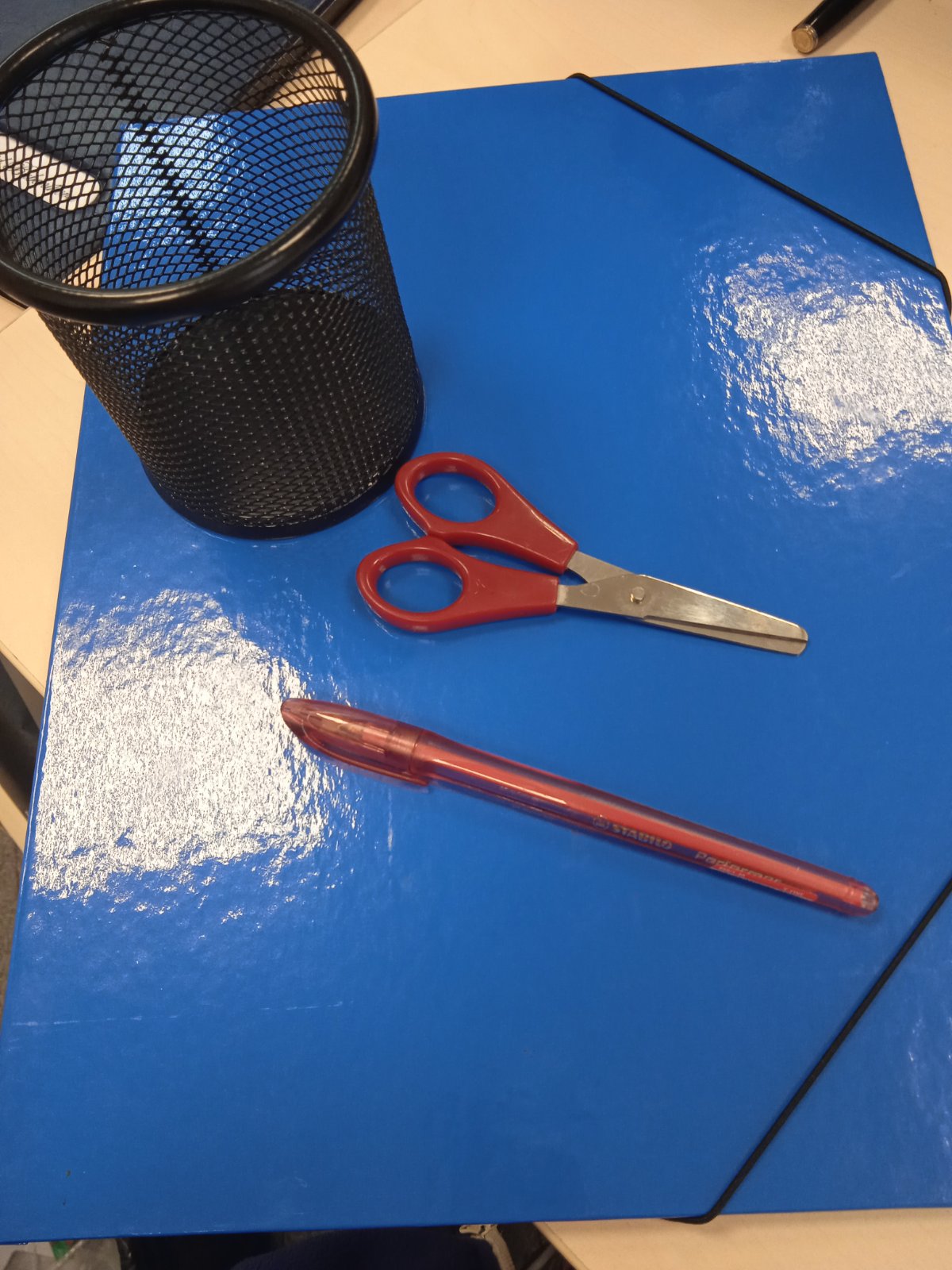 Stojan na perá, červené pero Stabilo , nožničky na papier, obal A4 - tvrdé dosky na gumixku