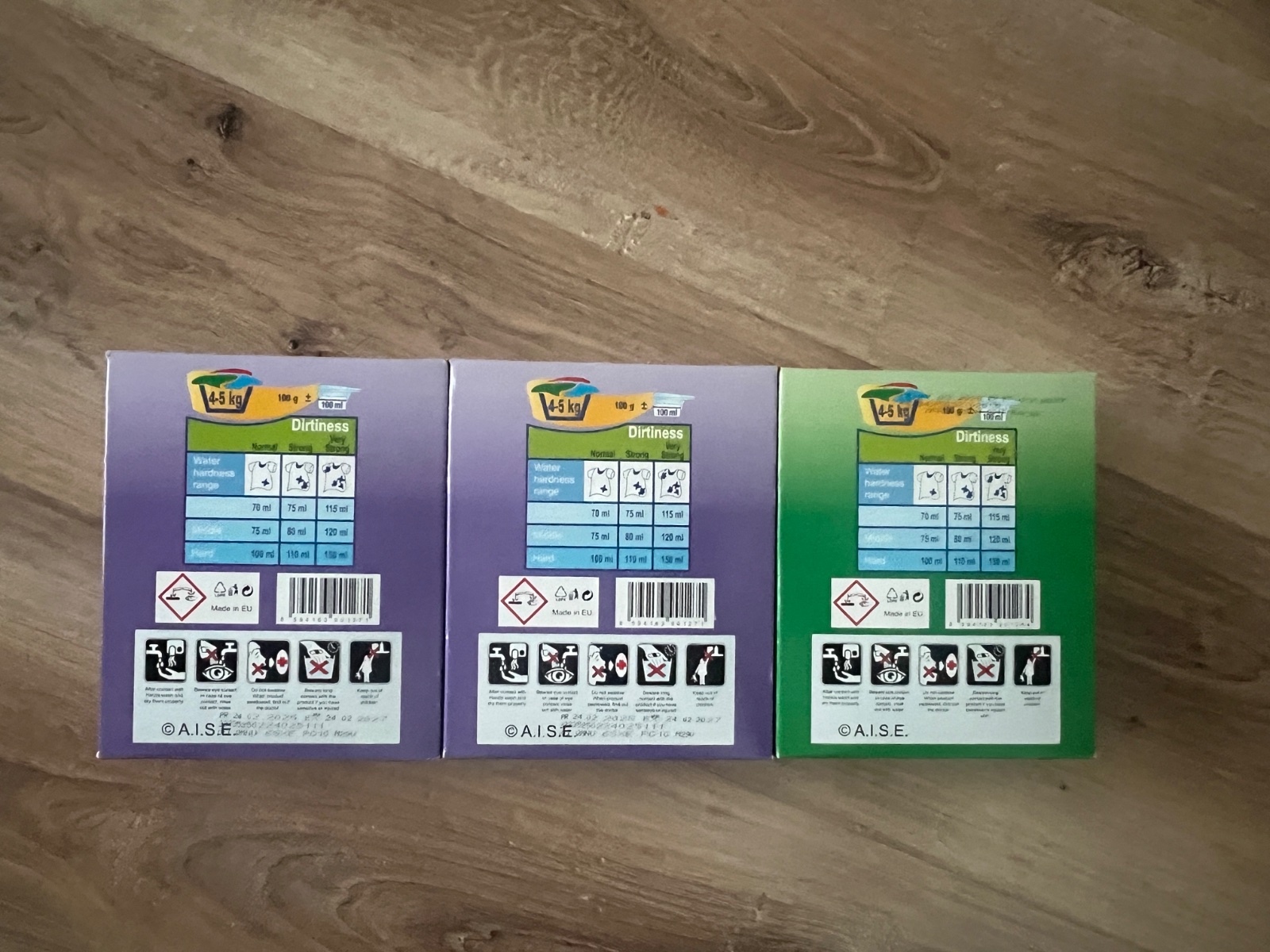 3 kusy pracích práškov Nice. Nové, nepoužívané. A 2 kusy pasty na umývanie rúk.