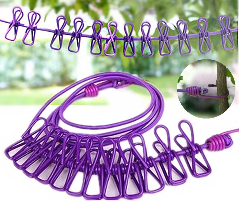 Cestovná šnúra na bielizeň, farba čierna, pás obsahuje 12 klipov, hrubé elastické laná nastaviteľné (roztiahnuteľné na 3 - 4 metra). Vyrobené z nehrdzavejúcej ocele a viacpramenných elastických gumičiek, sú pevné, odolné a nehrdzavejúce. Ľudia, ktorí milujú cestovanie, kempovanie, plávanie, rybolov, člnkovanie atď., ich môžu zavesiť medzi stromy alebo na koruny stromov, aby mali používatelia okamžitý priestor na sušenie kedykoľvek a kdekoľvek.