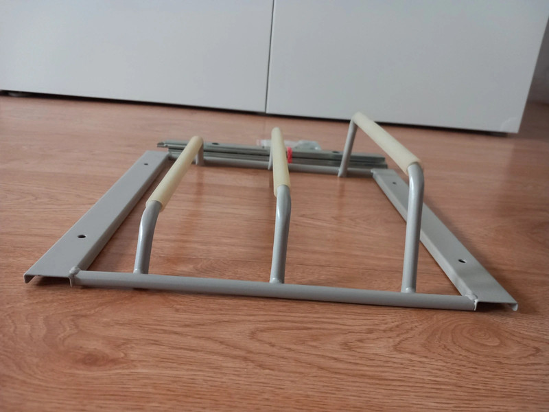 Výsuvný trojradový vešiak od ikea, zo staršej série Komplement, pre užšie skrine s hĺbkou 35-40 cm. Oceľ v béžovej farbe, na závesných tyčiach protišmykové návleky (možné odňať). Nosnosť vešiaka do 6kg. Komplet aj s montážnym príslušenstvom. U nás využitý krátko, šatník sme si po čase preorganizovali na výhradne policový.