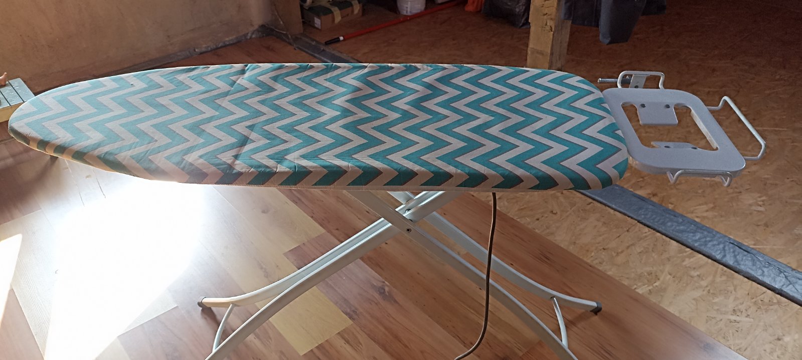 Veľká žehliaca doska aj s prívodovým káblom a so zásuvkou umiestnenou pod žehliacou doskou. Na jednej nožičke chýba plastová ochrana proti oskrababiu podlahy. Dá sa to však nahradiť.