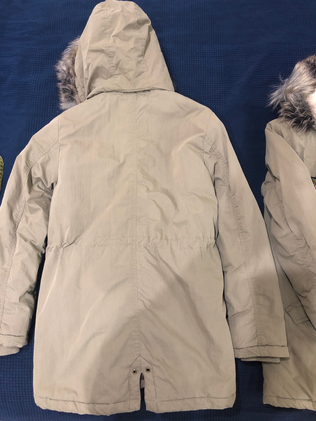 Hrubá teplá bunda s odnímateľnou kapucňou, zn. Lindex, super stav. Dĺžka 71 cm, rukáv 57 cm, v páse sťahovateľná. Cena za jednu