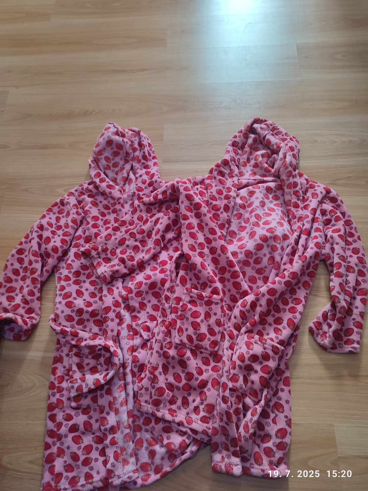 Predám župany Jahôdka pre dvojičky/ dievčatá, veľkosť 146/152, s kapucňou a opaskom, celková dĺžka 90 cm, rukáv 49 CM, aj jednotlivo, 1 ks - 4,50€, spolu 8€