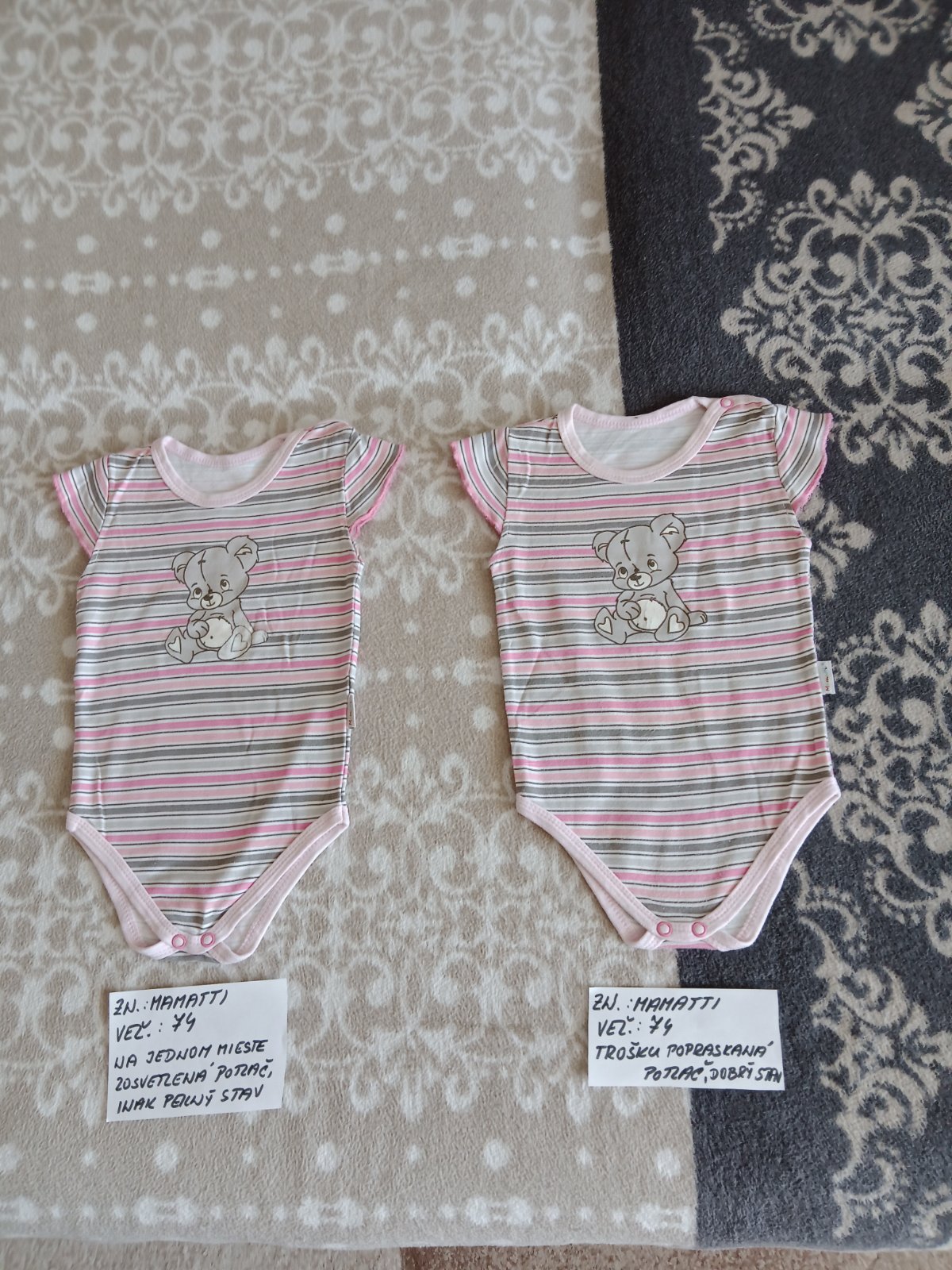 Predám dievčenské body s krátkym rukávom zn.Mamatti veľ.74,v peknom stave,len na jednom je trošičku popraskaný obrázok a na druhom je na obrázku trošku osvetlená nozicka.Cena za kus je 0,50centov