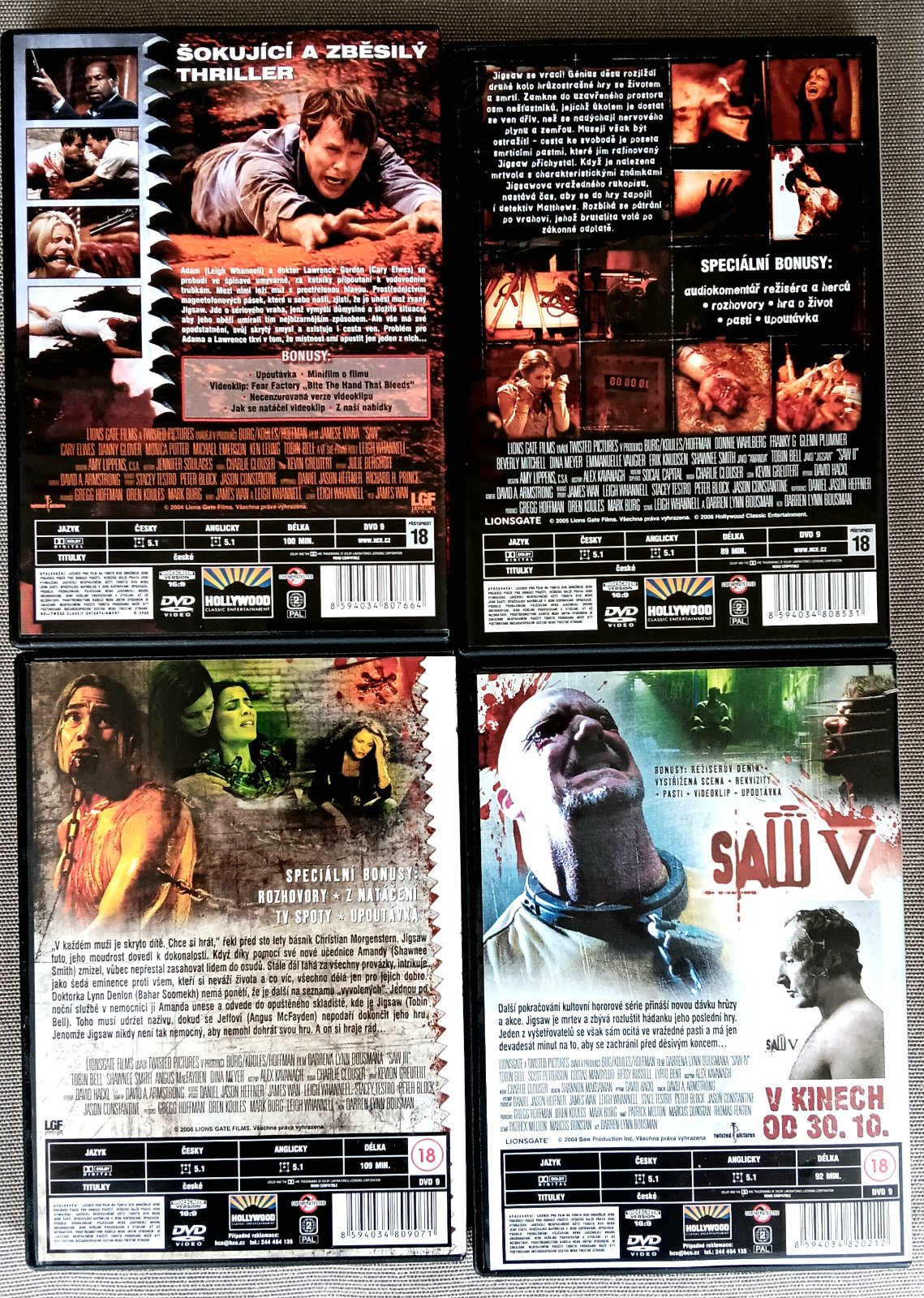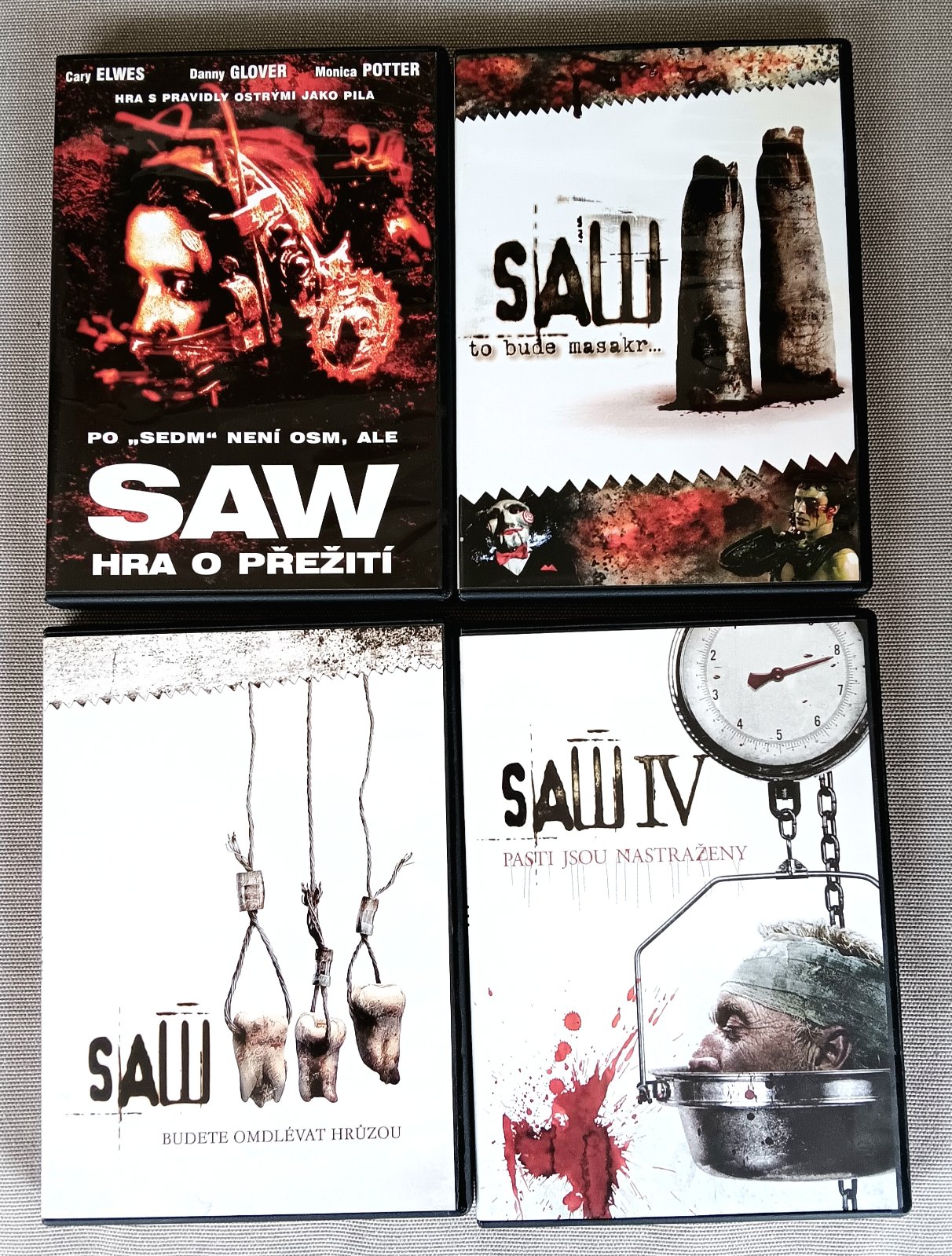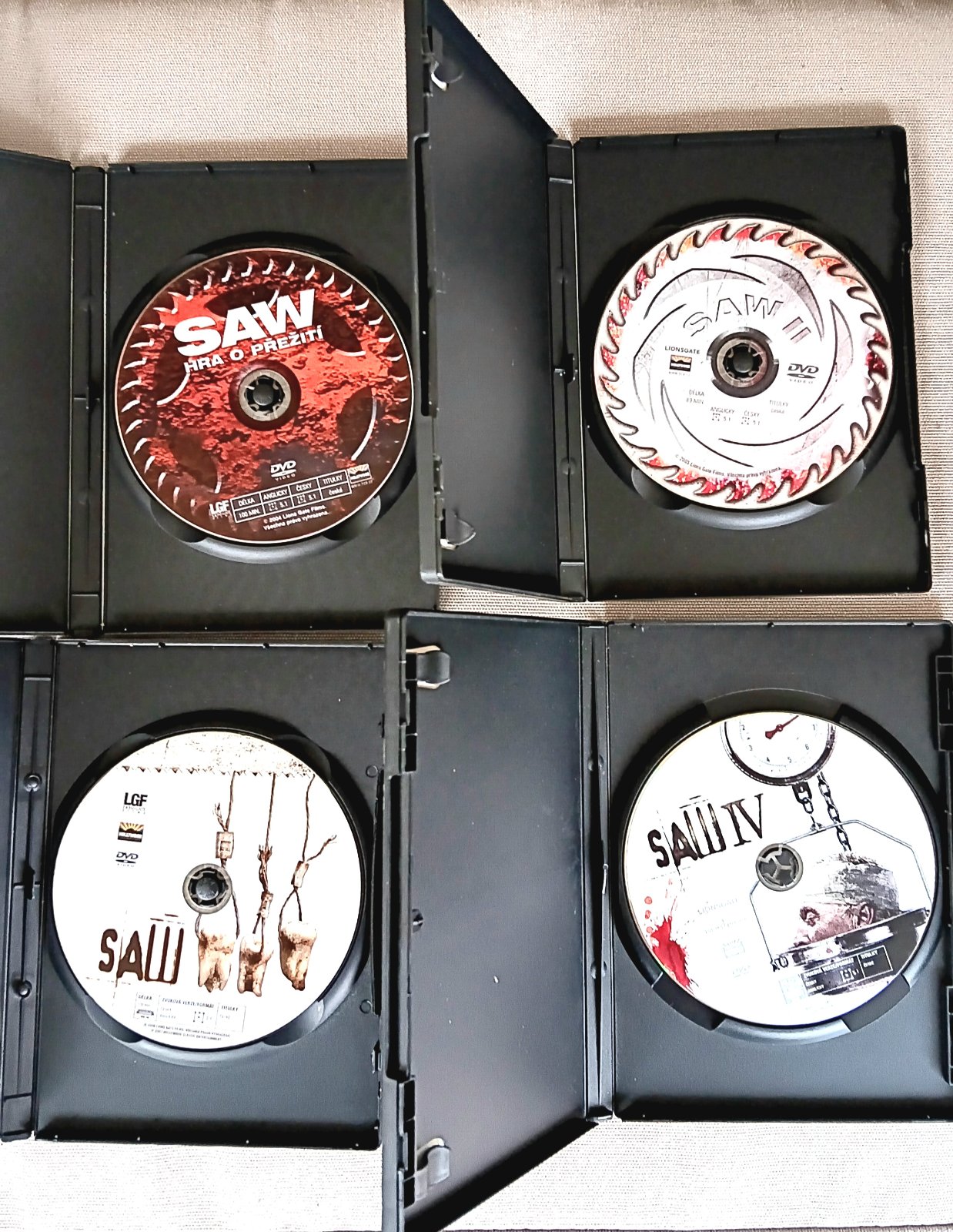 Predám 4 prehrané DVD SAW 1.-4.....v dobrom stave......hra o prežitie.....šokujúci thriller.....cena za všetky spolu 6€ alebo kus 2€.....cena plus poštovné