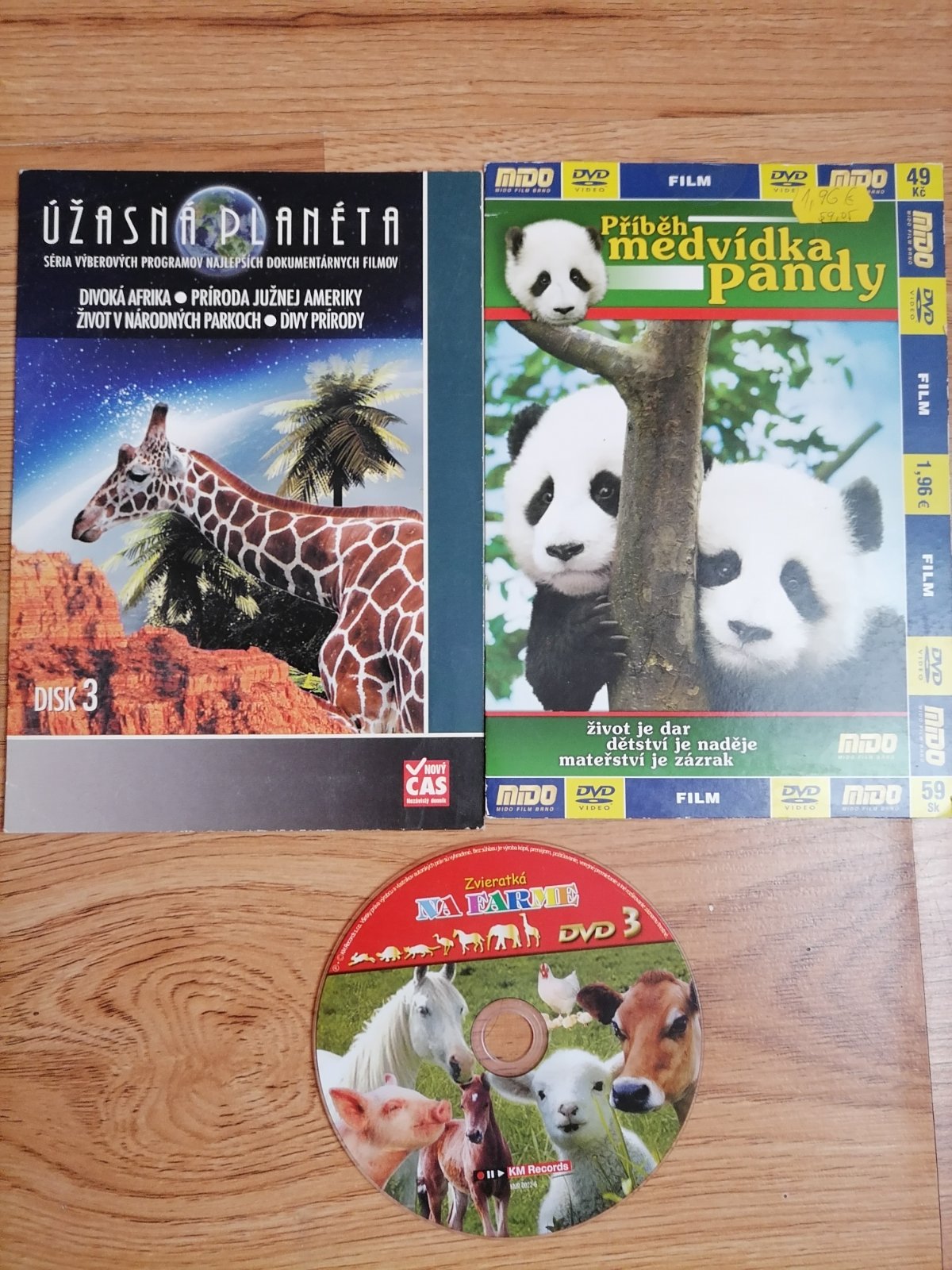 3x DVD. Úžasná planéta, Zvieratká na farme, Príbeh pandy. Mám aj iné dvd. Spolu len 2 €. V bazáriku mám veľa vecí 1x oblečené alebo len vyskúšané. Platba vopred na účet alebo osobný odber ZA