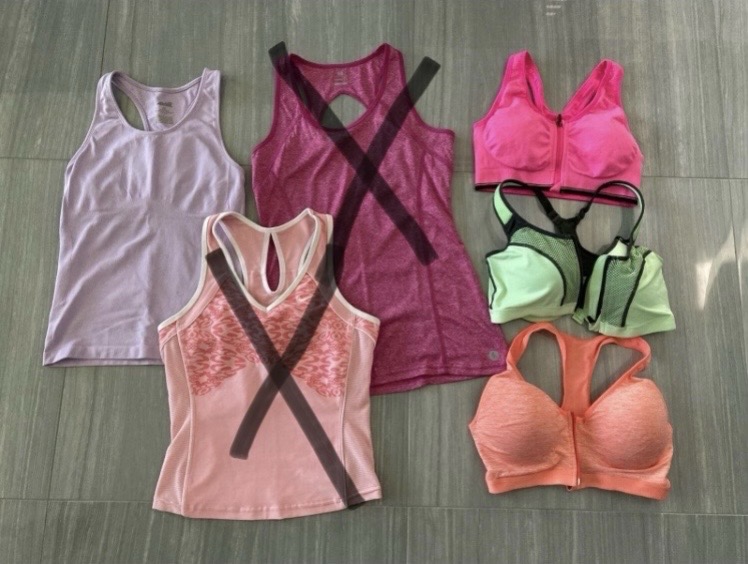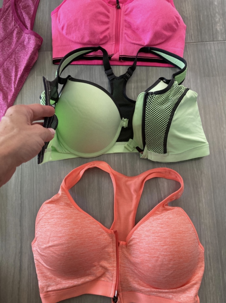 Bledofialové tričko je označené S, je veľmi elastické, sedí na S/M, dobre sa oblieka. Podprsenky za zapínajú vpredu, ružová je M, zelená je 85C a oranžová 80C. Oblečenie je nenosené, nevyužijem. Cena za všetko.